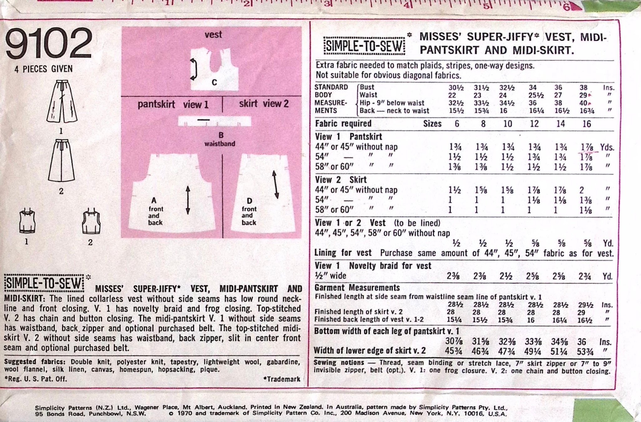 Misses' Vest, Midi-Pantskirt & Midi-Skirt: Get creative with your sewing projects with this Vintage Sewing Pattern! This Simplicity 9102 pattern from the 70's offers versatile options like a lined collarless vest with unique closures and a midi-pantskirt or midi-skirt without pesky side seams. Make a statement and stand out with this Simple-To-Sew Misses' Super-Jiffy pattern. ©1970. RARE FIND!