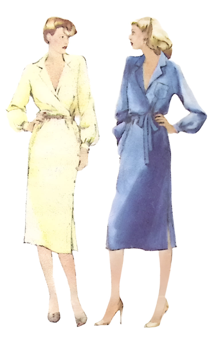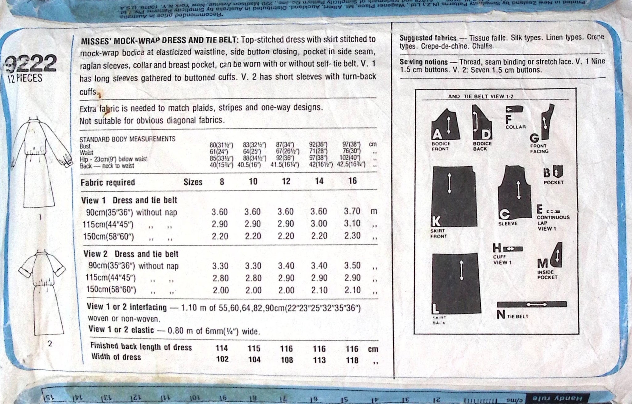Misses' Mock-Wrap Dress & Tie Belt: This vintage sewing pattern features a top-stitched dress with a mock-wrap design and an elasticised waistline. It includes a side button closure, a pocket in the side seam, and raglan sleeves with a collar and breast pocket. The dress can be worn with or without the self-tie belt, and comes in both long or short sleeve options. Perfect for creating a retro and stylish look! ©1979.