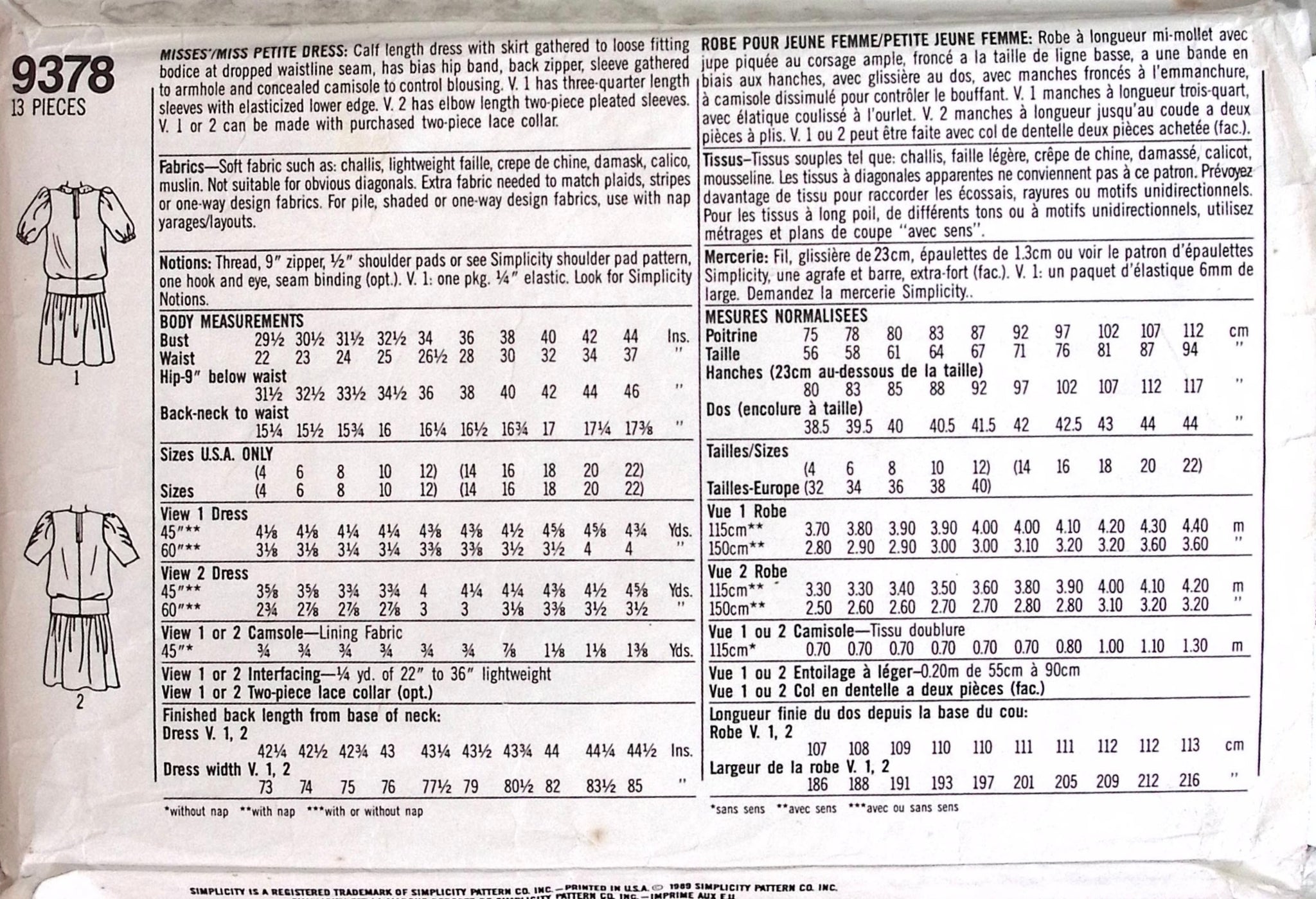 Misses' Dress: Create a wardrobe full of unique dresses with the Vintage Sewing Pattern: Simplicity 9378! Designed by Jane Schaffhausen for belle france, this Calf-length dress features a gathered skirt, loose fit bodice, and bias hip band for a flattering silhouette. With options for different sleeve lengths and a delicate lace collar add-on, you can make your dress truly one-of-a-kind. ©1989.