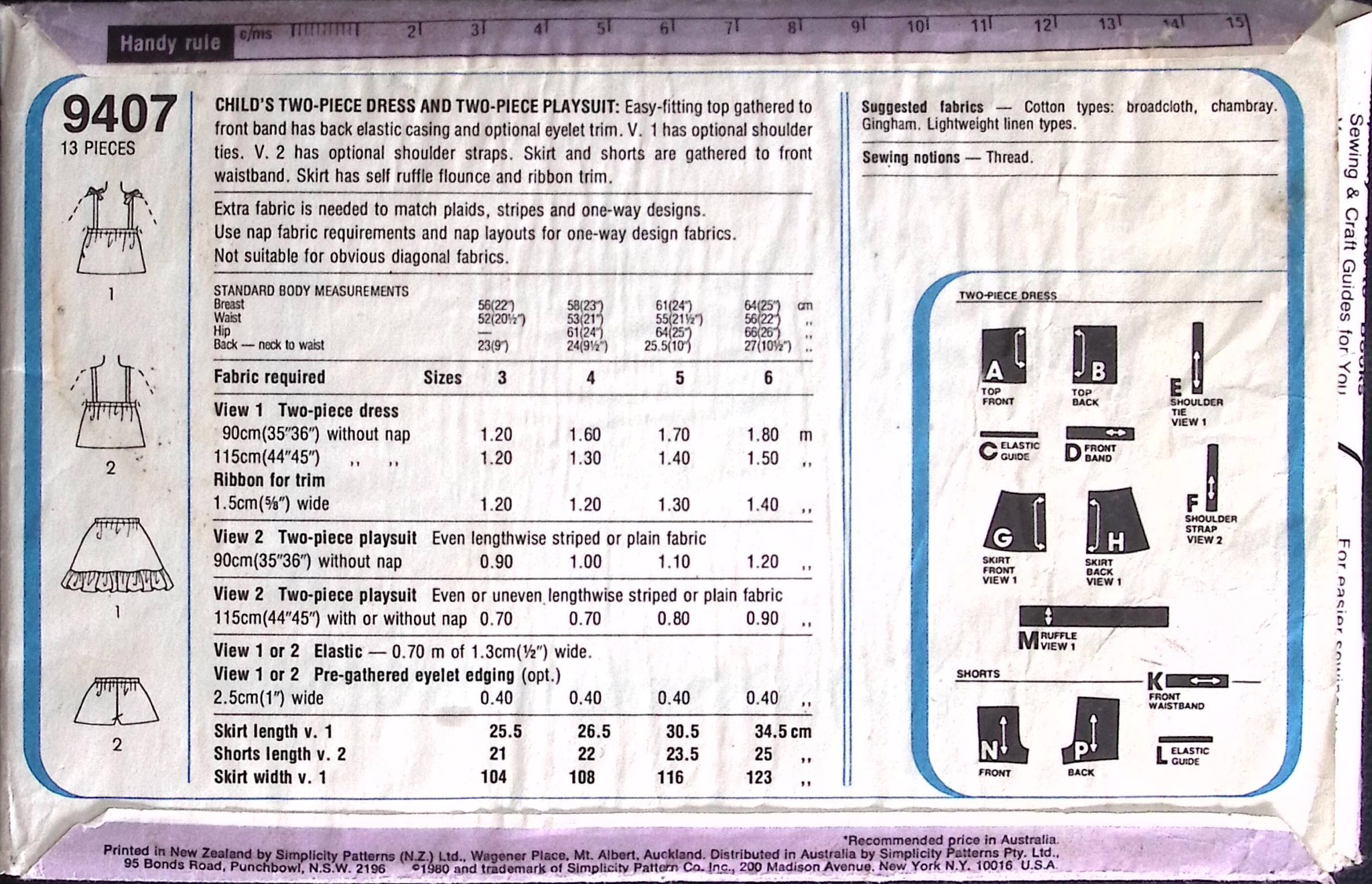 Child’s Two-Piece Dress & Two-Piece Play-Suit: The easy-fitting top is gathered to a front band and features a back elastic casing for a comfortable fit. You can add optional eyelet trim, shoulder ties, or shoulder straps for extra charm. The skirt and shorts, also gathered to a front waistband, boast back elastic casings for flexibility. The skirt includes a self-ruffle flounce and ribbon trim, adding a playful touch to the outfit. ©1980.