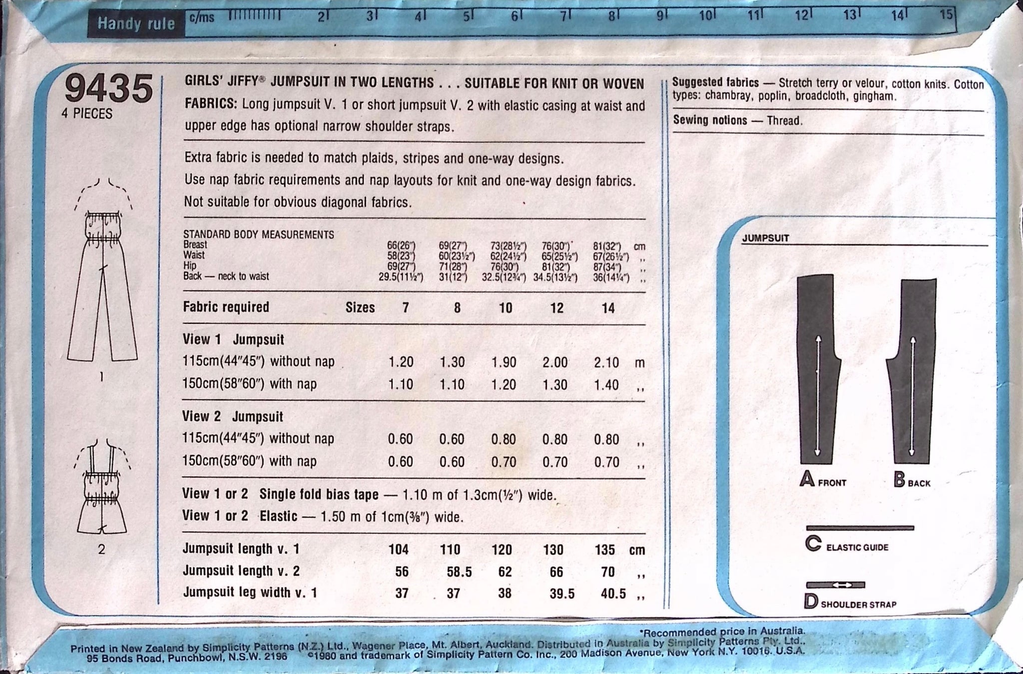 Girl's Jumpsuit: Step back into the 1980s with this pattern for girls' jumpsuits in two lengths. The long jumpsuit (V.1) offers a stylish option, while the short jumpsuit (V.2) features an elastic casing at the waist and upper edge. The versatility of V.2 includes optional narrow shoulder straps, allowing for a customizable look. Recreate the fashionable trends of the 1980s with these jumpsuits, providing comfort and style for girls in both warm and cooler weather. Whether opting for a long or short version, this pattern captures the fun and flair of 80s fashion for the younger generation. ©1980.
