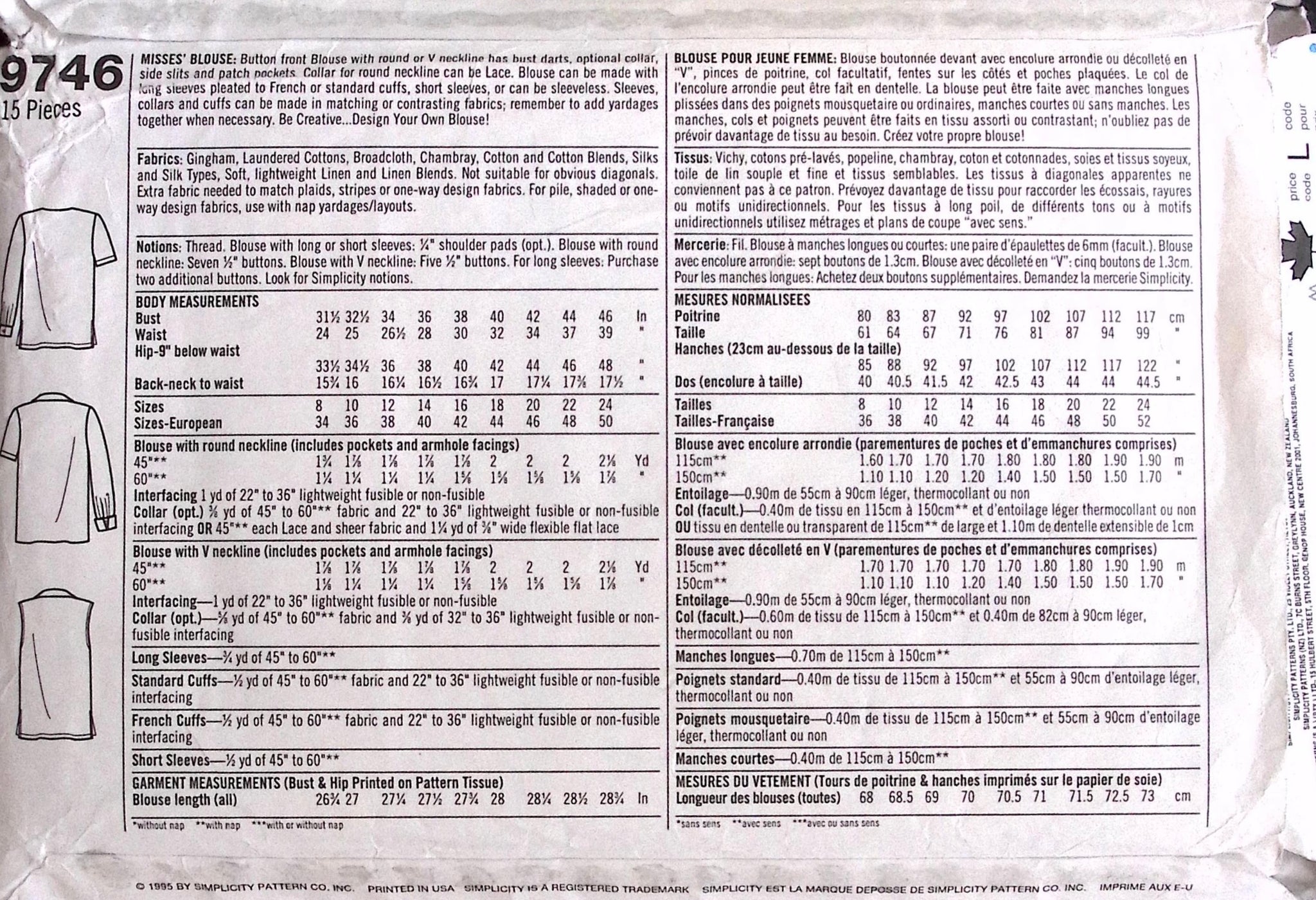 Misses' Blouse: Cute and versatile blouse pattern perfect for any vintage sewing enthusiast. Features gathered sleeves in long or short length with the option for buttoned cuffs or bands. Mix and match collar options including fabric rose and lace trim for a unique touch. Sewing made stylish and fun with Simplicity 9746. ©1995.