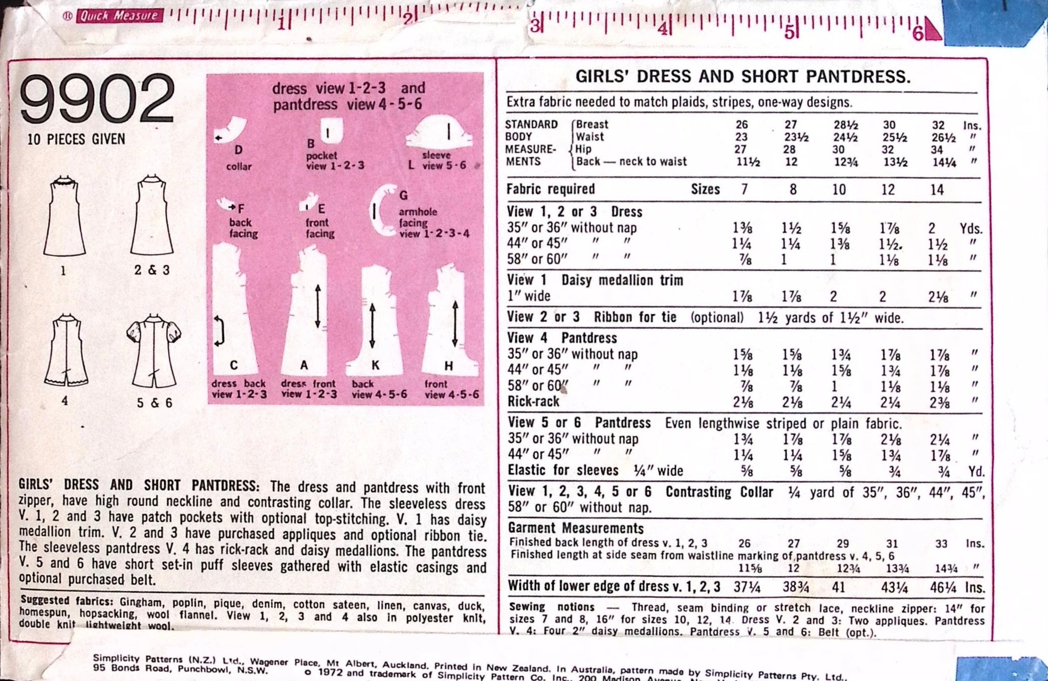 Girl's Dress & Pant-Dress: Get creative with the Vintage Sewing Pattern: Simplicity 9902! This dress and pant-dress with a front zipper and high round neckline come in various styles, including a sleeveless dress with patch pockets and medallion trim. Or try the pant-dress with short puff sleeves and rick-rack details. Don't miss the option for a purchased ribbon or belt to add the perfect finishing touch. ©1972.