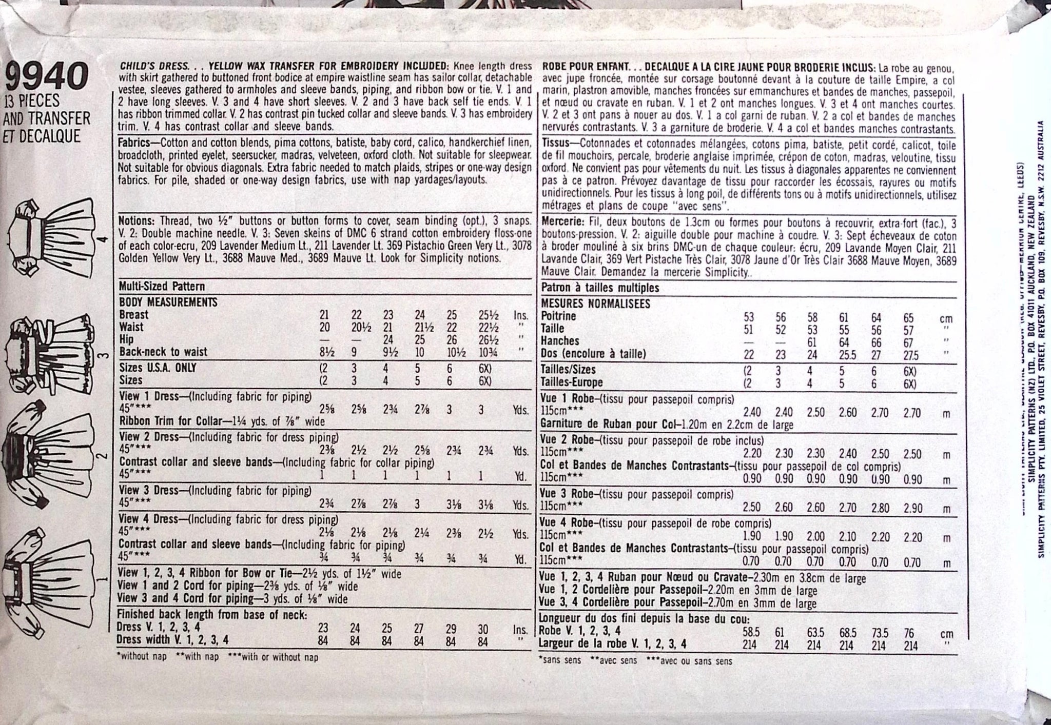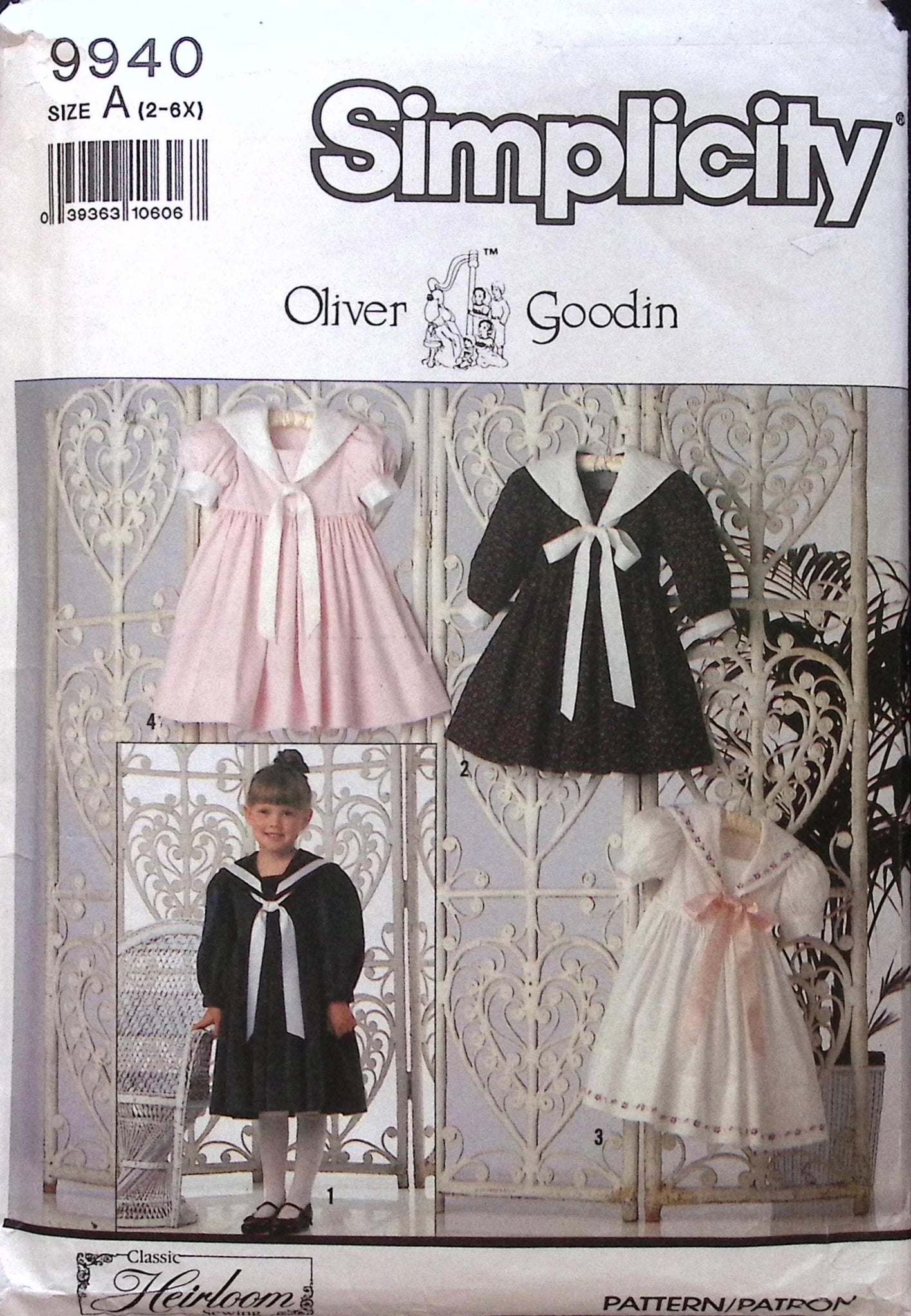 Child's Dress: Get ready to sew up some vintage charm with this 90's design by Oliver Goodin. This child's dress features a knee length skirt, gathered bodice, and adorable sailor collar. Plus, the included yellow wax transfer makes embroidery a breeze. With multiple sleeve and collar options, it's perfect for any occasion! ©1990.