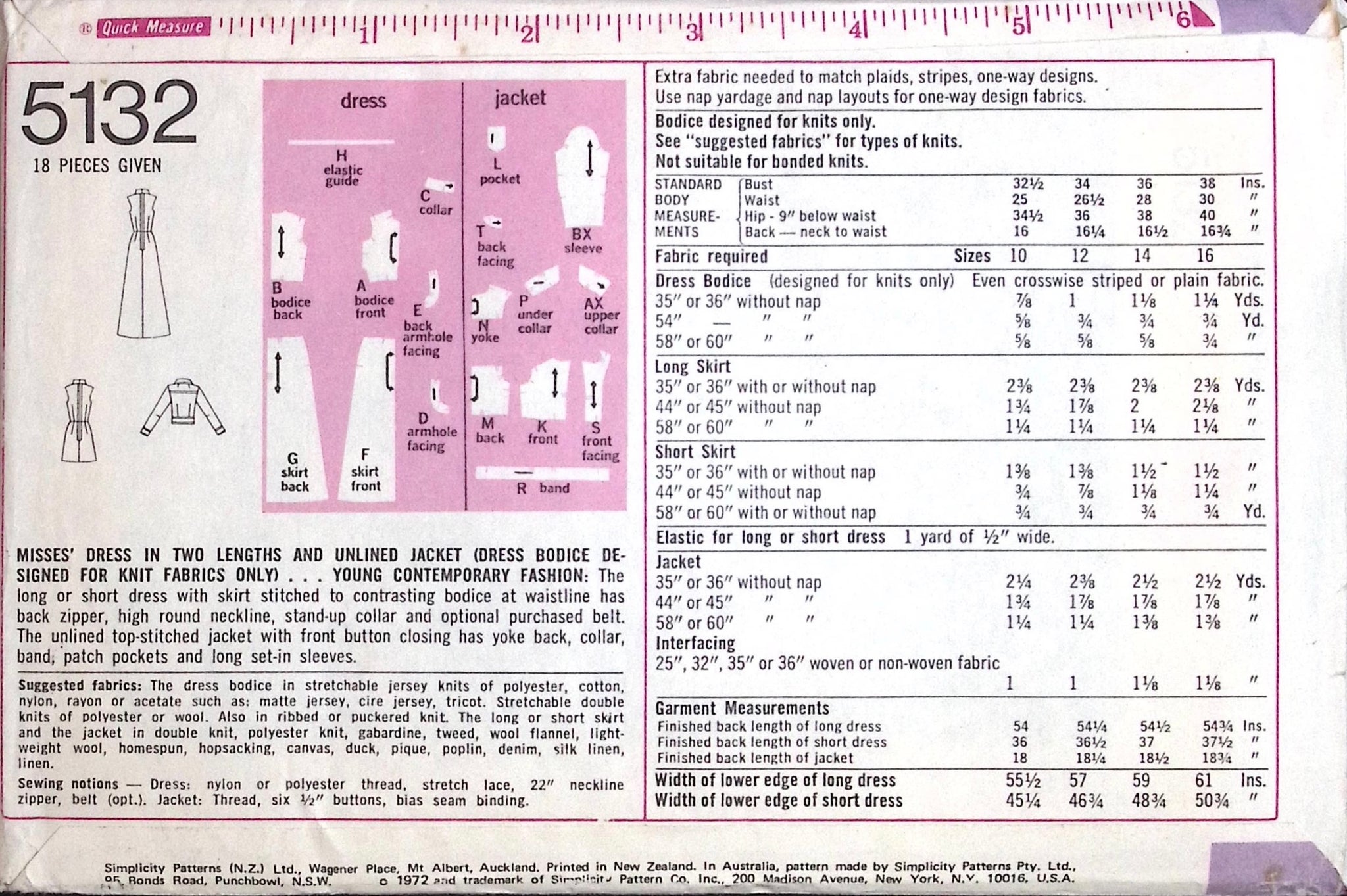Misses’ Dress & Jacket: This vintage gem captures the essence of the time, offering a chic and comfortable ensemble designed exclusively for knit fabrics. Picture yourself in the iconic silhouettes of the era, with the dress featuring a skirt stitched to a contrasting bodice at the waistline, boasting a back zipper, high round neckline, stand-up collar, and the option of a purchased belt for that extra touch of elegance. Meanwhile, the unlined jacket exudes retro charm with its top-stitched detailing, front button closure, yoke back, collar, band, patch pockets, and long set-in sleeves. With its timeless design and classic silhouette, this pattern allows you to recreate the effortlessly stylish looks of the 1970s, perfect for any occasion where you want to channel vintage vibes with a modern twist. ©1972.