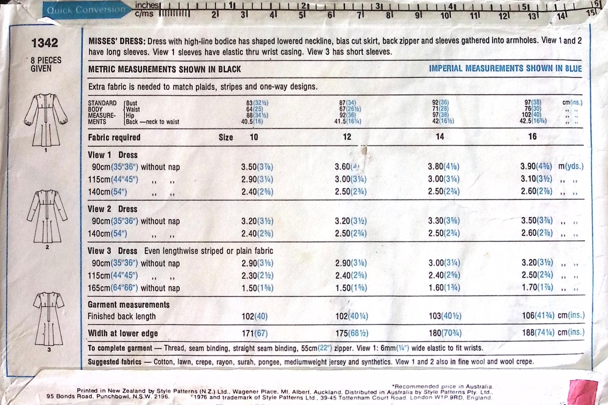 Misses’ Dress: A high-line bodice with a shaped lowered neckline for a flattering look. The bias-cut skirt adds elegance to the design, while the back zipper ensures easy dressing. The sleeves are gathered into armholes, providing comfort and flexibility. You have the option of fitted long sleeves, long puffed sleeves with elastic at the wrists, or short sleeves, allowing for customisation based on personal style and preference. ©1976.