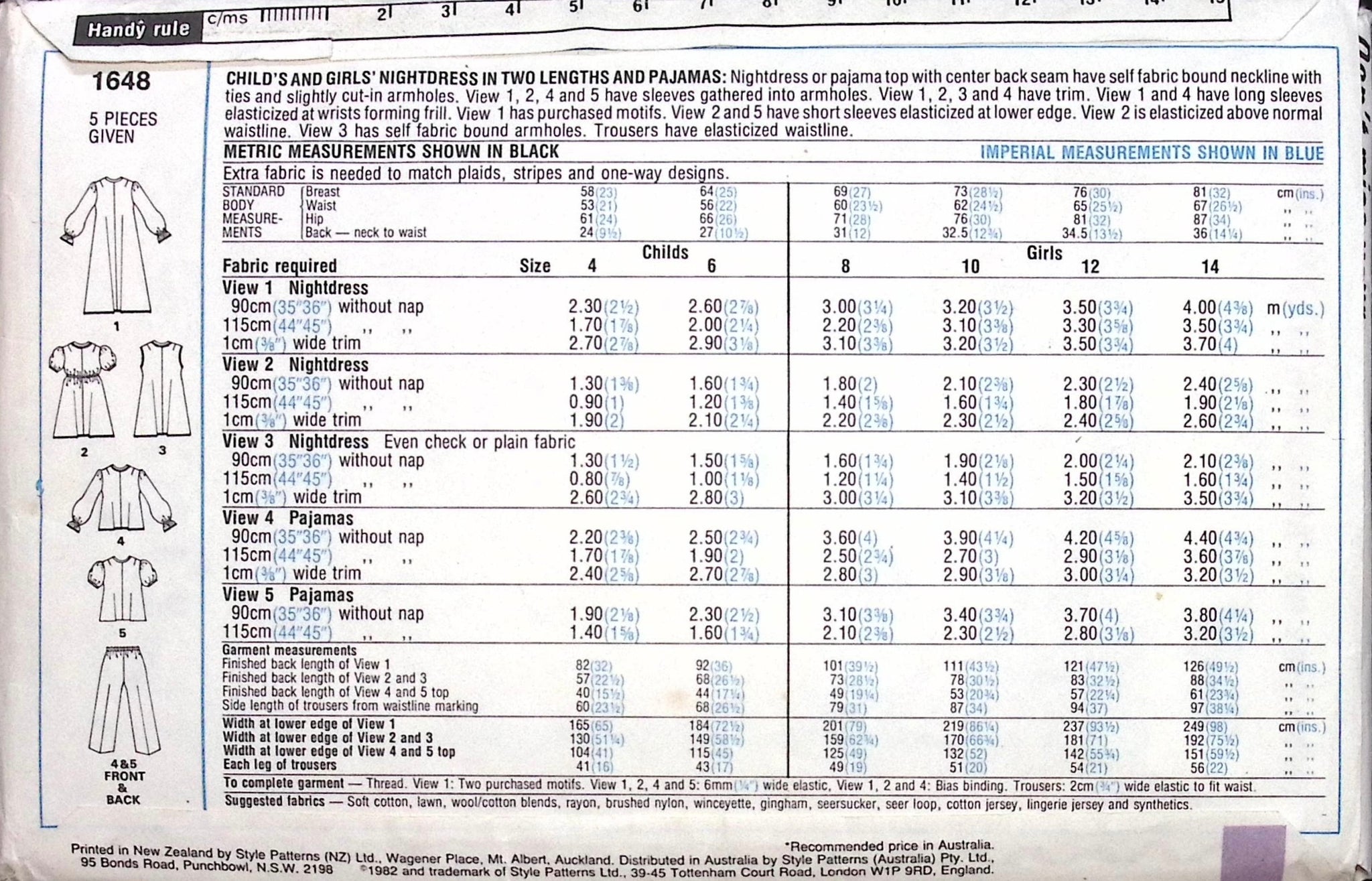 Child’s Nightdress & Pyjamas: The nightdress or pyjama top features a center back seam and a self-fabric bound neckline with ties, along with slightly cut-in armholes for comfort. Choose from long sleeve, short puff sleeve, or sleeveless options to suit your preference. Option 2 includes an elasticised waistline above the normal waistline. Create cozy and stylish sleepwear with this versatile pattern. ©1982.