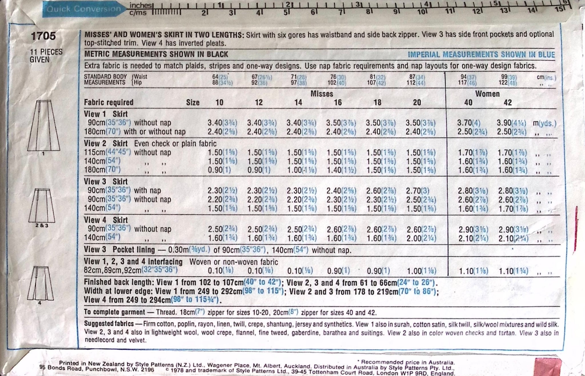Misses’ Skirts: The skirt pattern features six gores, a waistband, and a side back zipper for easy wear. View 3 includes side front pockets for practicality and offers optional top-stitched trim for added detail. On the other hand, View 4 showcases inverted pleats for a stylish and sophisticated touch. Whether you prefer a classic design with pockets or a more elegant look with pleats, this pattern provides versatile options to suit your style. ©1978.