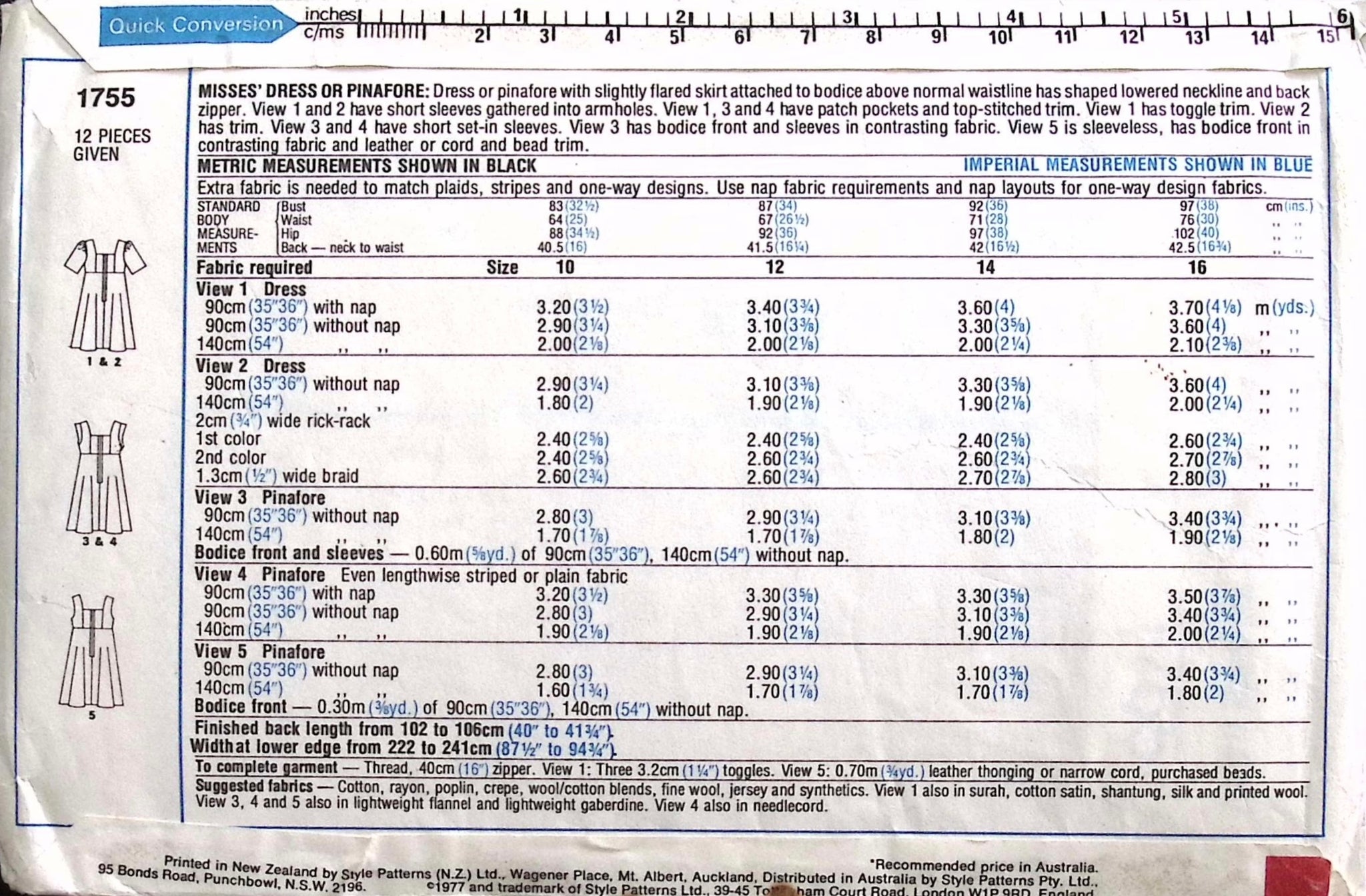 Misses’ Dress or Pinafore: A versatile garment with a slightly flared skirt attached to the bodice above the normal waistline, featuring a shaped lowered neckline and a back zipper for easy dressing. Options abound, including short sleeves gathered into armholes with patch pockets and top-stitched trim for a classic look, or toggle trim for added detail. Alternatively, choose short set-in sleeves or opt for a sleeveless style for a different silhouette. You can also customise the garment with a contrasting fabric for the bodice front or add leather or cord and bead trim for a touch of uniqueness and flair. ©1977.