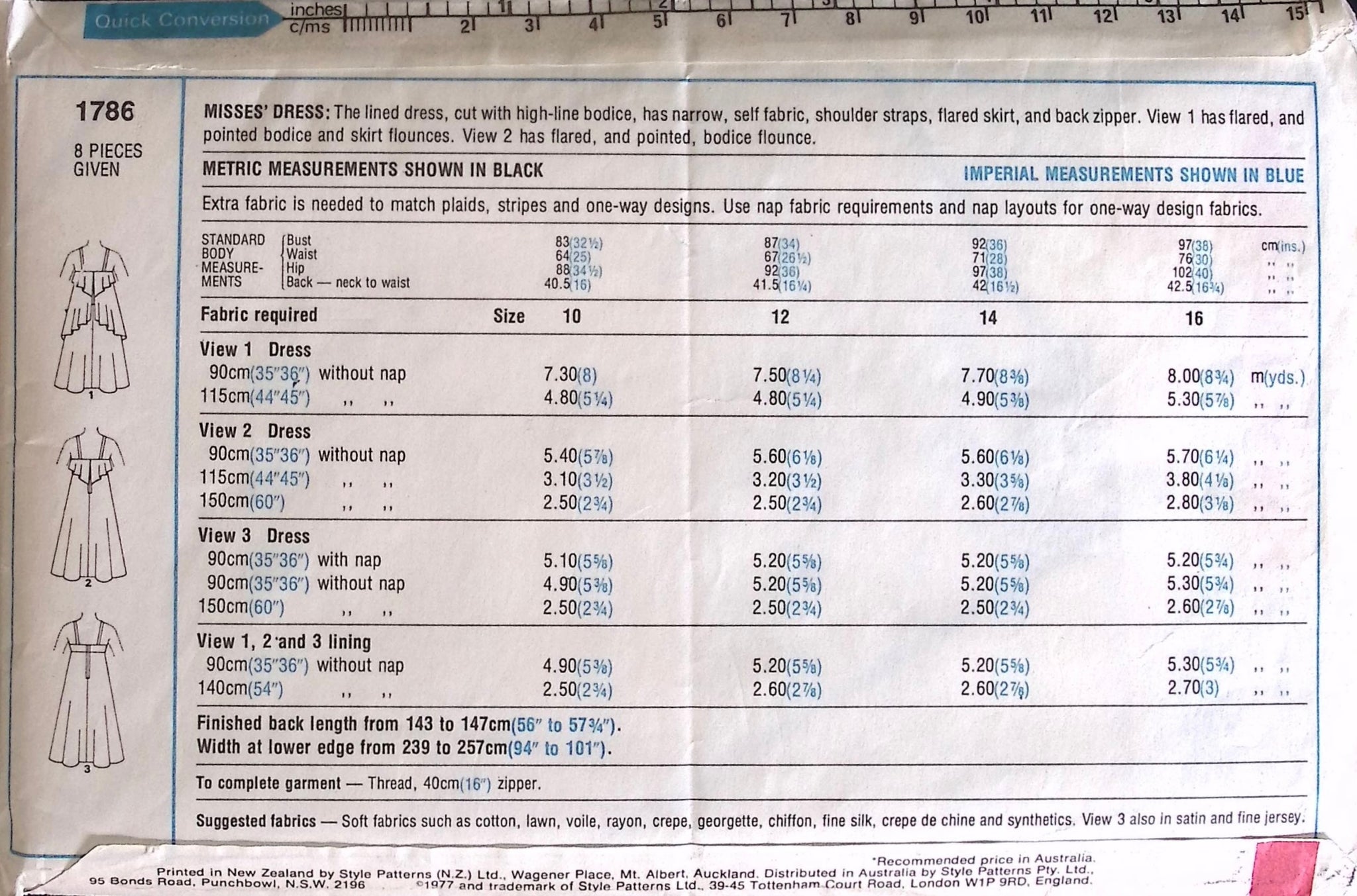 Misses' Dress: This lined dress, epitomising the era's style, features a high-line bodice and narrow self-fabric shoulder straps for a chic look. The flared skirt adds a touch of sophistication, and the back zipper ensures a seamless fit. Choose from the option of flared and pointed bodice and skirt flounces to customize your dress with a unique and stylish flair. Capture the essence of the '70s in your wardrobe with this versatile pattern, offering a blend of retro charm and timeless elegance. ©1977.