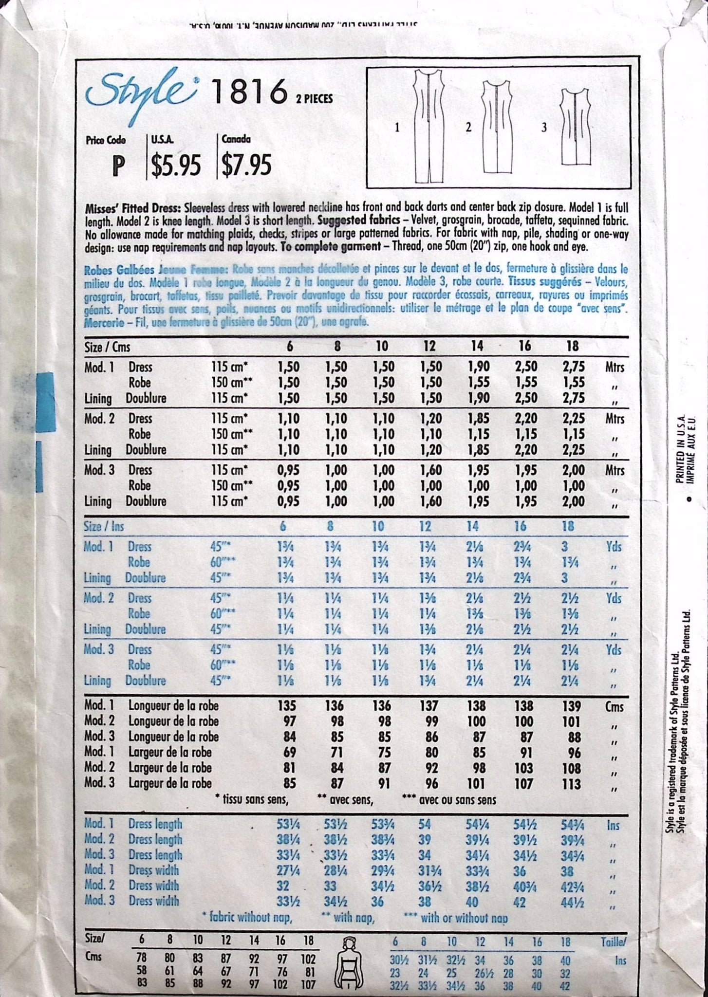 Misses’ Dress: pattern offers versatility with a sleeveless design and a lowered neckline. Front and back darts ensure a tailored fit, while the pattern includes options for mini, midi, and full lengths, allowing for customisation to suit different occasions and personal preferences. ©1990.