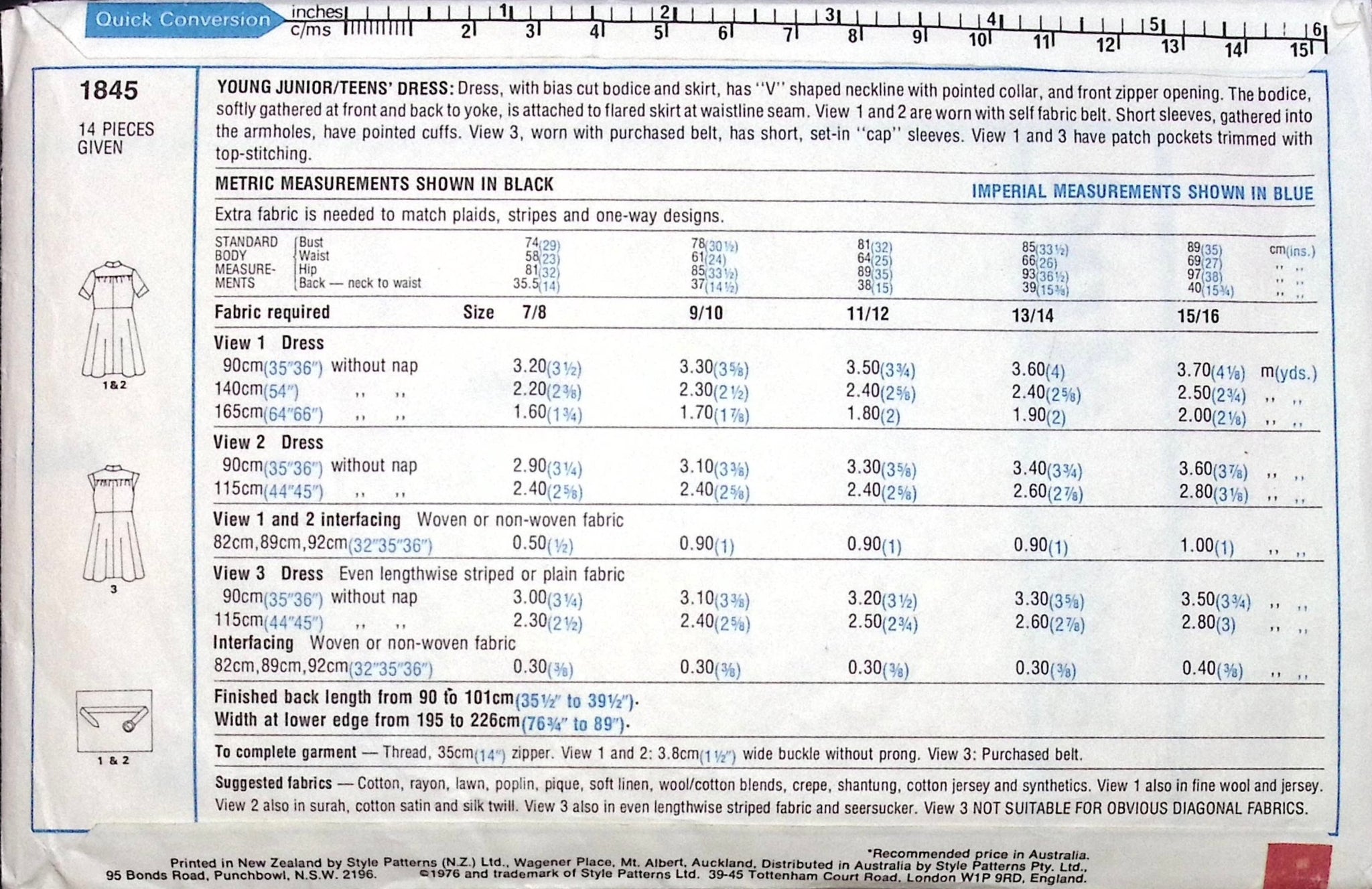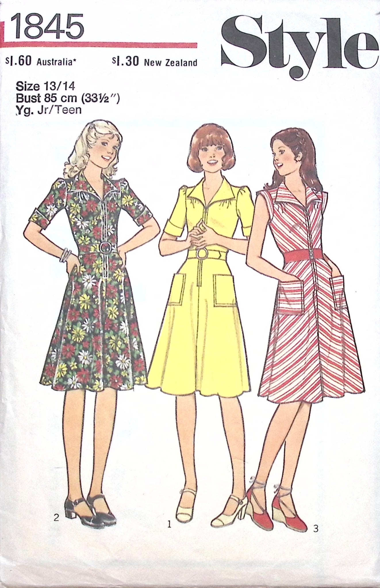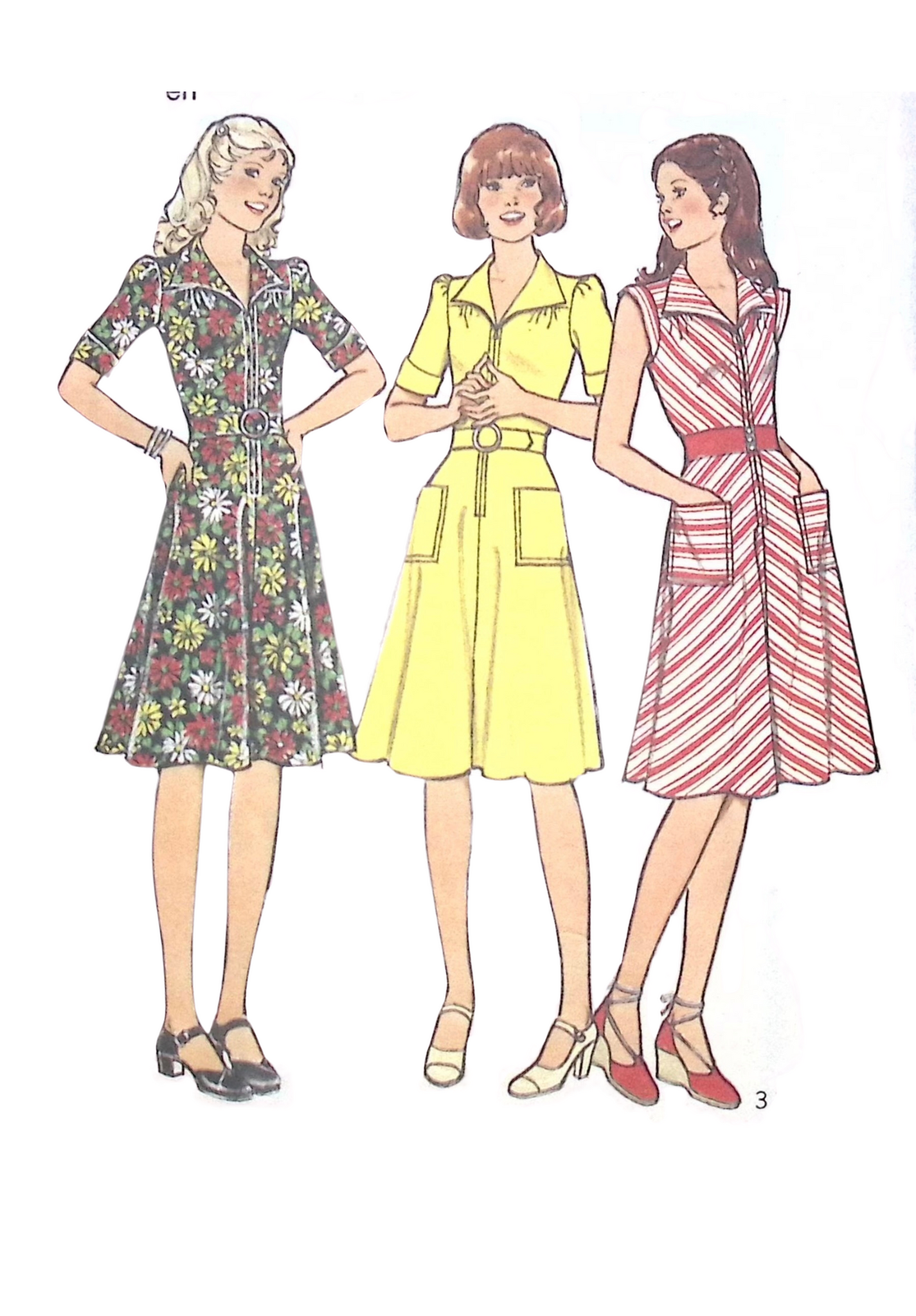 Junior-Teens Dress: A stylish ‘70s sewing pattern featuring a bias-cut bodice and skirt, designed with a V-shaped neckline and pointed collar. The dress includes a front zipper opening, with the bodice softly gathered at the front and back to a yoke attached to a flared skirt at the waistline. You have the option of adding a self-fabric belt, choosing between short or cap sleeves, and adding patch pockets for extra detail. This versatile pattern offers chic options suitable for various occasions. ©1976.