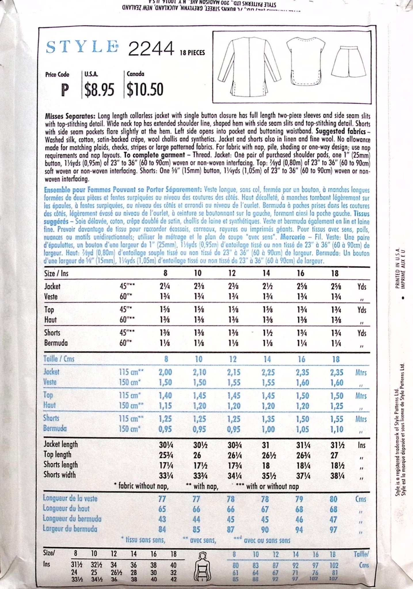Misses' Separates: Elevate your vintage wardrobe with this timeless sewing pattern featuring four essential separates. Create a sophisticated collarless jacket in a flattering long length, perfect for layering and adding polish to any outfit. Pair it with a chic wide neck top that flatters the shoulders, then complete the look with tailored shorts featuring practical side seam pockets. This versatile collection gives you endless styling possibilities, from casual weekend wear to refined everyday elegance. Ideal for sewers seeking classic, wearable pieces that transcend seasonal trends. ©1992.