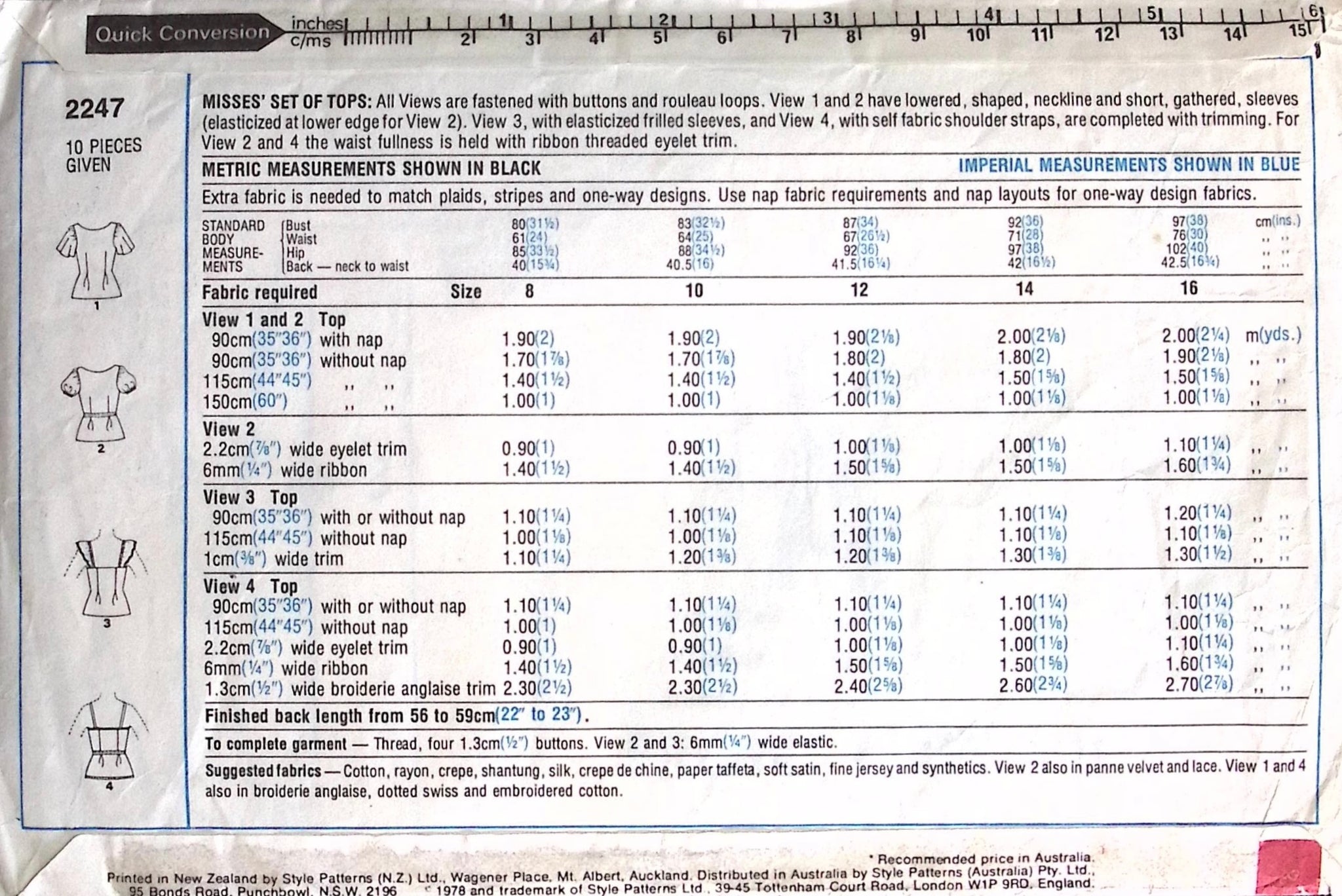 Misses’ Tops: This '70s pattern for Misses' set of tops showcases the diverse styles of the era, offering various options for customisation. Each top features buttons and rouleau loops for a chic closure. Choose from a lowered, shaped neckline and short, gathered sleeves, with the option for elasticised edges or elasticised frilled sleeves for a playful look. Additionally, tops with self-fabric shoulder straps are adorned with trimming, adding an extra touch of style to the ensemble. ©1978.