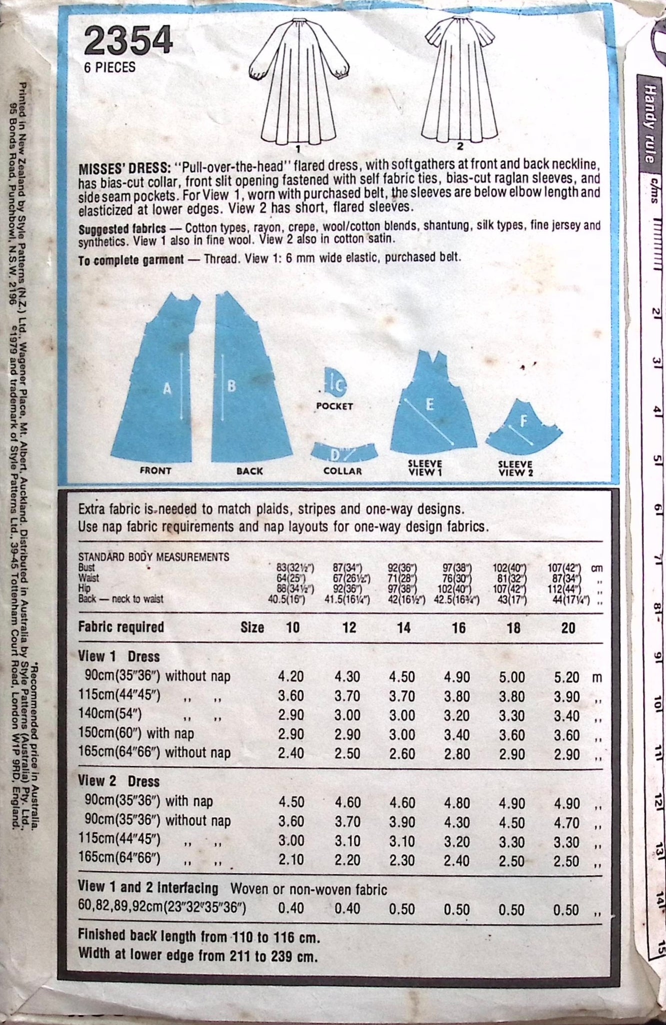 Misses’ Dress: The pull-over-the-head design featured a flared silhouette with soft gathers at the front and back neckline, creating a flattering drape. It boasted a bias-cut collar and a front slit opening fastened with self-fabric ties, adding a touch of elegance. The dress included bias-cut raglan sleeves and convenient side seam pockets. Options included wearing it with a purchased belt for added style. Additionally, you could choose between below-elbow-length sleeves elasticised at the lower edges for a relaxed look or short, flared sleeves for a more playful vibe. ©1979.