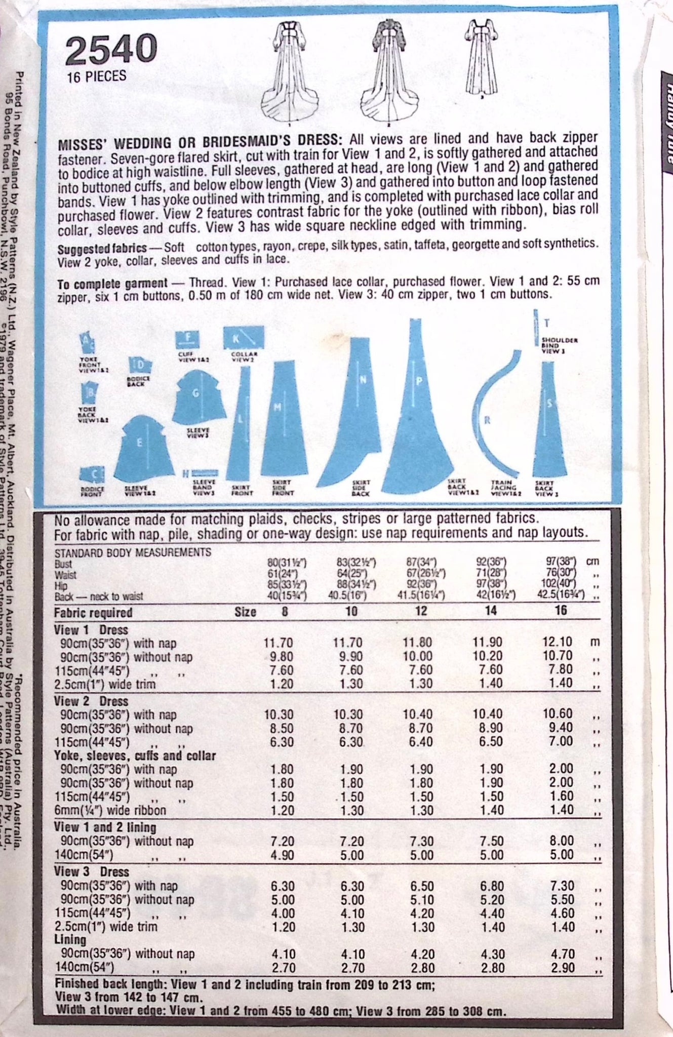 Misses' Wedding or Bridesmaid's Dress: Step back in time with this exquisite 70's vintage sewing pattern featuring timeless elegance and romantic details. The seven-gore flared skirt with graceful train creates a stunning silhouette, while full sleeves gathered at the shoulders offer classic charm. Choose from three distinct views: a yoke adorned with lace collar and flower accents, a contrast-fabric yoke with ribbon detailing and bias roll collar, or a wide square neckline trimmed to perfection. Long sleeves gather into buttoned cuffs, with a shorter below-elbow option featuring button-and-loop fasteners. Perfect for recreating vintage-inspired garments with authentic 70s flair and sophisticated construction details. ©1979. Rare Find!
