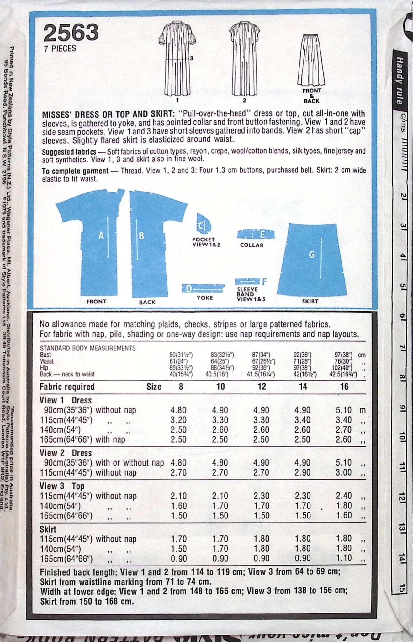 Misses’ Dress, Top & Skirt: Introducing a classic '70s sewing pattern for misses featuring a versatile design that can be used to create a dress, top, or shirt. This pull-over-the-head style garment is cut all in one with sleeves and a gathered yoke. It includes a pointed collar and front button closure for a timeless look. Create stylish and comfortable outfits with this adaptable pattern reminiscent of the fashionable designs of the era. ©1979.