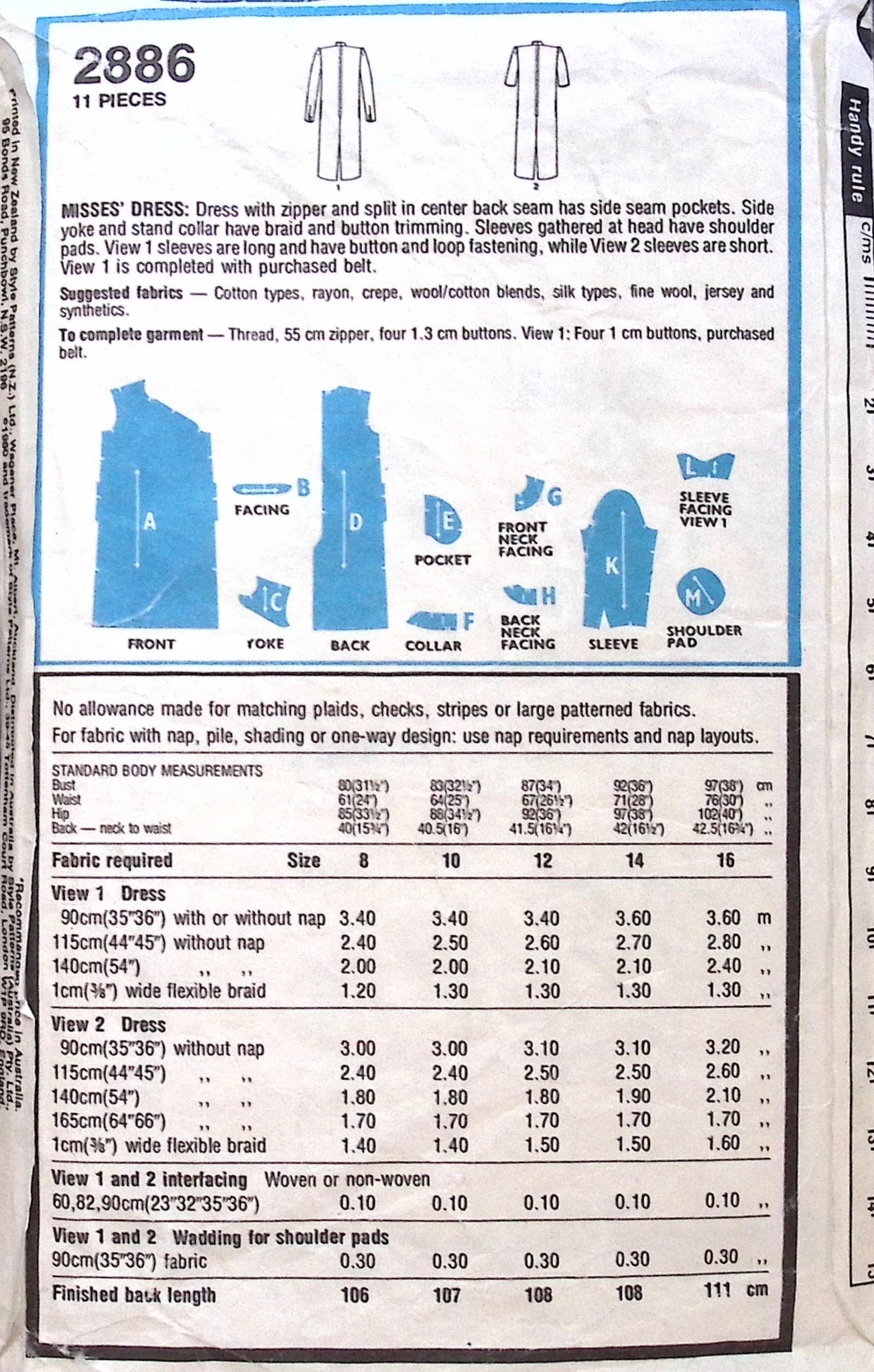 Misses' Dress: Get vintage vibes with Style 2886 sewing pattern. This dress features a zipper, split back seam, and side pockets for convenience. The braid and button embellishments on the yoke and collar add a touch of style. With options for long or short gathered sleeves, plus a purchased belt for the finishing touch, this dress is a must-have for any retro wardrobe. ©1980.