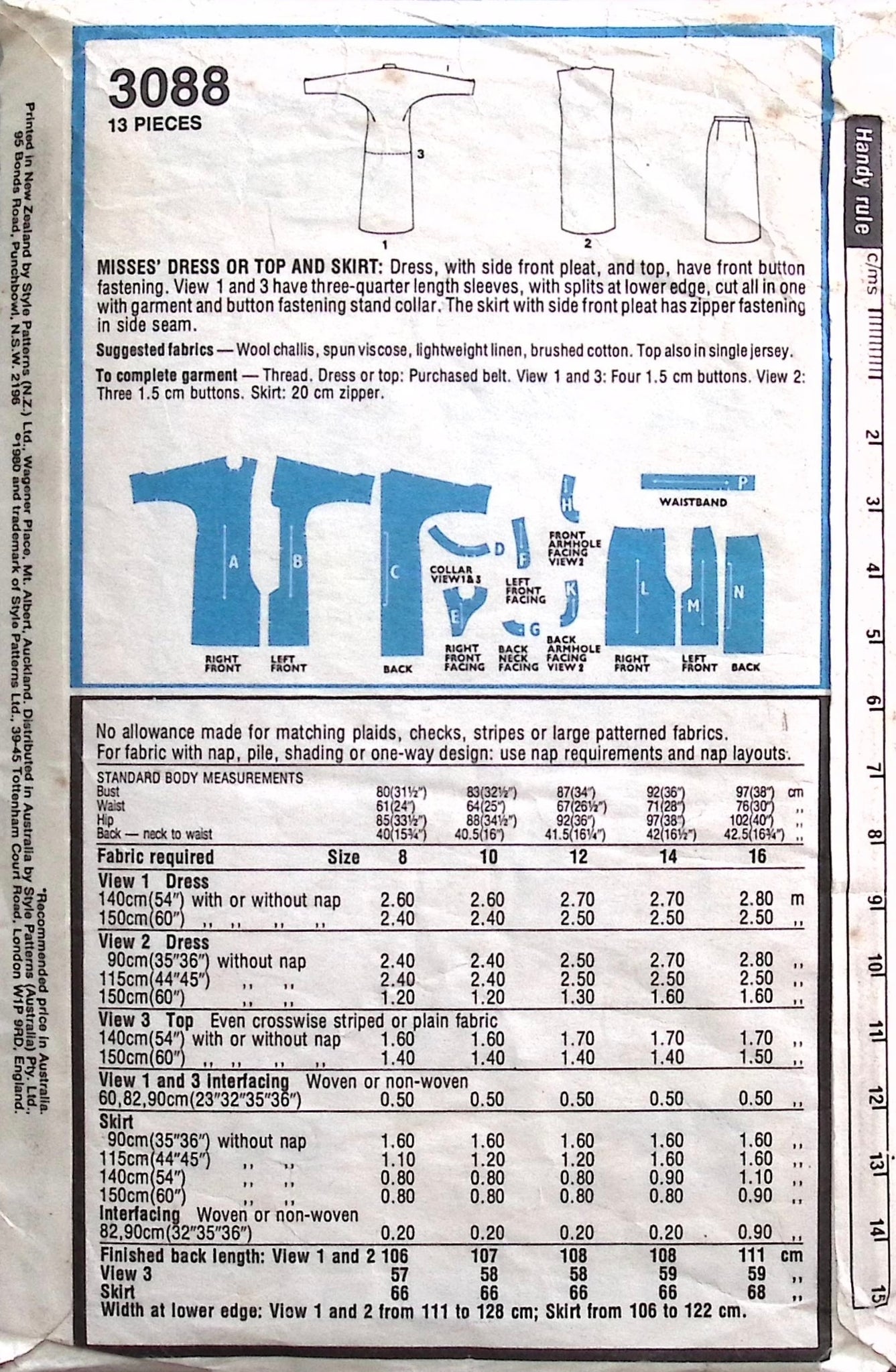 Misses' Dress or Top: Pattern offers the option to create either a dress or top with a side front pleat and front button fastening. The three-quarter sleeves feature splits at the lower edge, adding a stylish detail to the garment. Whether you choose to make the dress or top, this pattern provides a versatile and chic option for your wardrobe. ©1980.