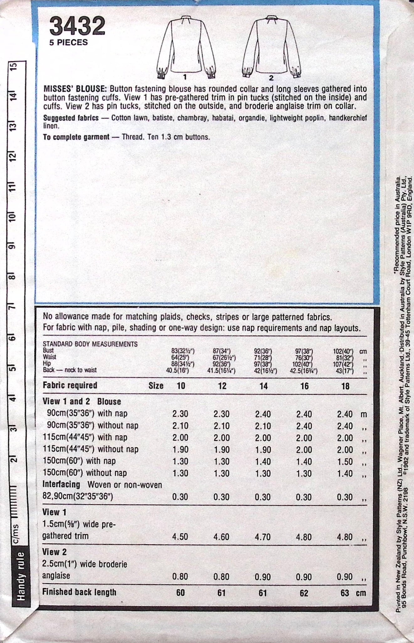 Misses' Blouse: This pattern is a button-up with a rounded collar for a timeless and versatile look. The pre-gathered trim and pin tucks are a subtle yet sophisticated touch, while the broderie anglaise trim adds an elegant touch to the collar. Easy to customise, perfect for vintage fashion lovers. ©1982.
