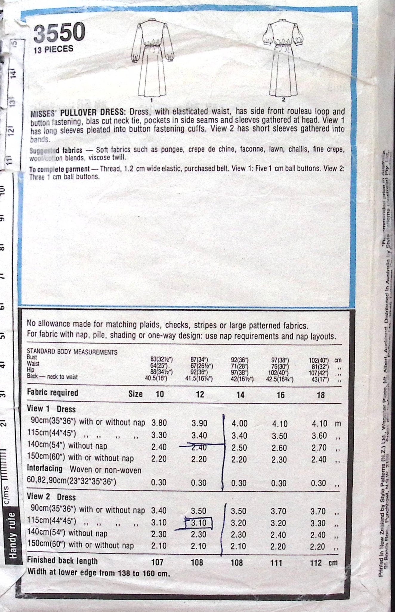 Misses' Dress: Get ready to turn heads with our Vintage Sewing Pattern: Style 3550. This misses' pullover dress features an elasticated waist for a comfortable fit, side front button and loop fastening, and pockets in the side seams. Choose between long sleeves with button fastening cuffs or short sleeves with gathered bands. A bias cut neck tie adds a touch of elegance. ©1981.