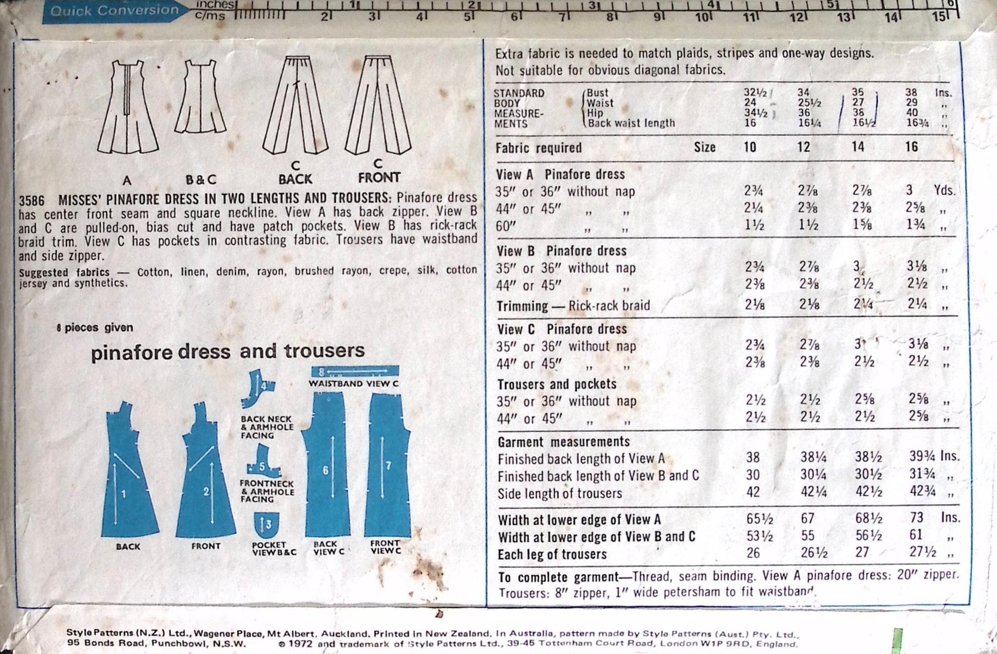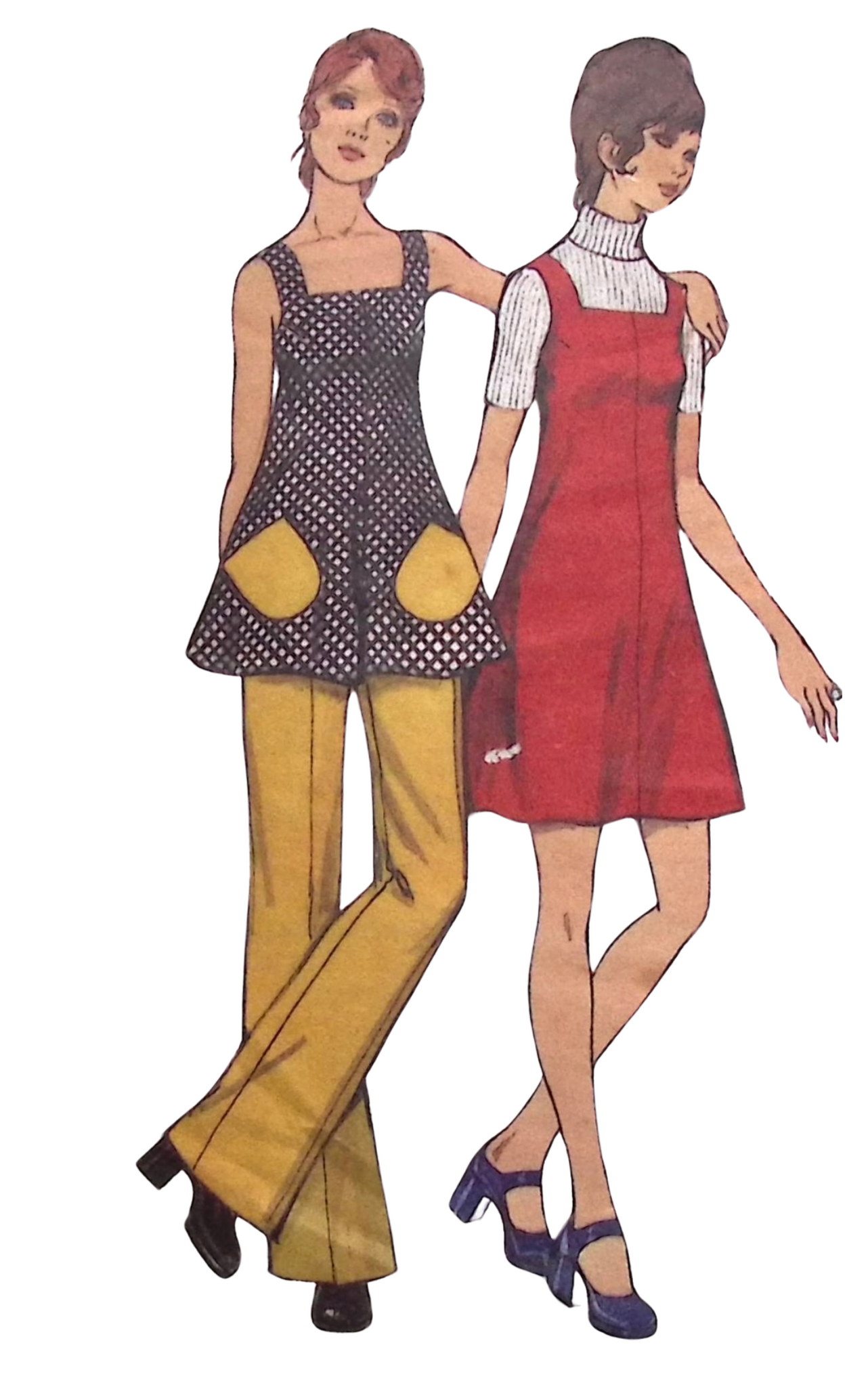 Misses' Pinafore Dress & Trousers: This pattern features a versatile pinafore dress in two lengths, perfect for layering over blouses or sweaters. Additionally, you'll find patterns for trousers, providing comfort and versatility for everyday wear. Whether you're looking for a classic dress or practical trousers, this pattern has you covered with ‘70s flair and functionality. ©1972.