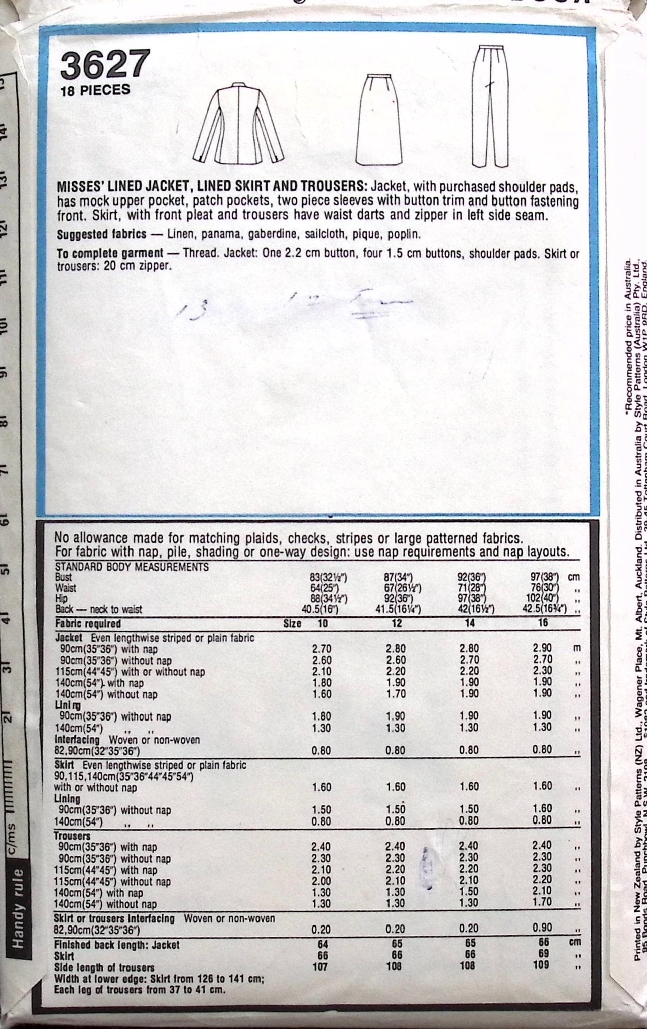 Misses’ Jacket, Skirt & Trousers: A complete ensemble with a lined jacket, lined skirt, and trousers. The lined jacket provides structure and sophistication, while the skirt and trousers offer versatility for various occasions, all reflecting the fashionable trends of the era. ©1982.
