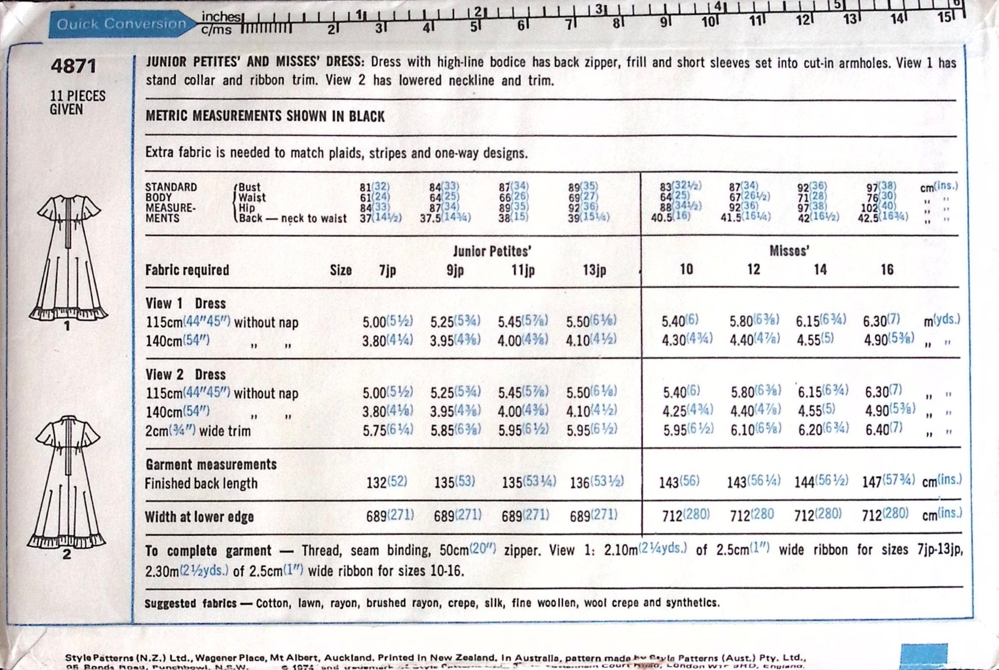 Misses' Dress: Elevate your vintage sewing collection with this authentic 70's pattern. This versatile design features a flattering high-line bodice with a convenient back zipper, paired with charming short sleeves set into cut-in armholes. Choose between two distinct looks: View 1 showcases a sophisticated stand collar with elegant ribbon trim, while View 2 offers a modern lowered neckline with coordinating trim. Perfect for recreating classic 70s style or adding timeless pieces to your wardrobe. Ideal for intermediate sewers seeking quality vintage patterns with character and charm. ©1974.