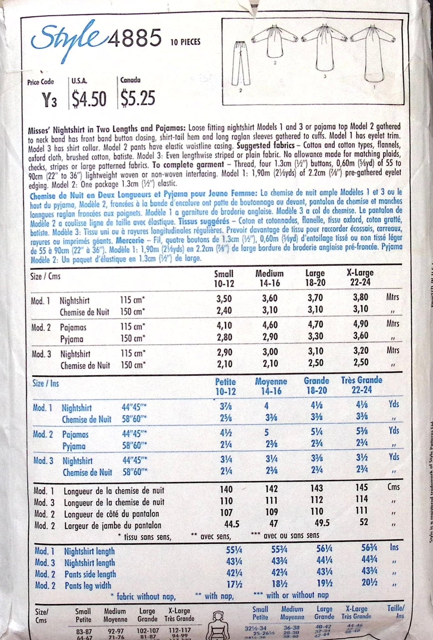 Misses' Nightshirt & Pyjamas: This vintage sewing pattern, from the 80's, offers a playful and fun option for creating a comfortable nightshirt or pyjama top with long raglan sleeves and shirttail hem. The pyjama pants feature an elastic waistband for added comfort. So why settle for boring sleepwear? Let your unique style shine with Style 4885. ©1985.