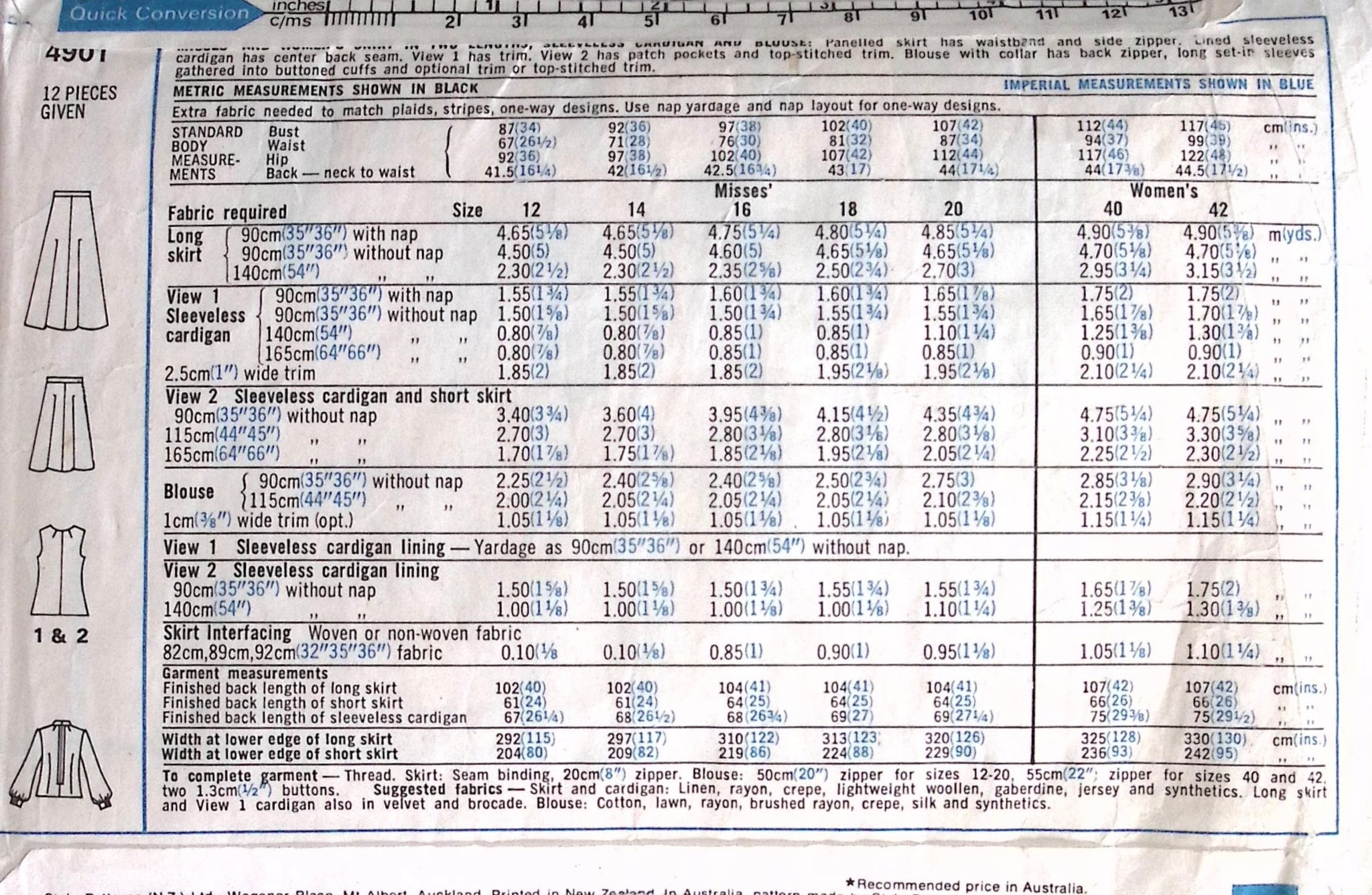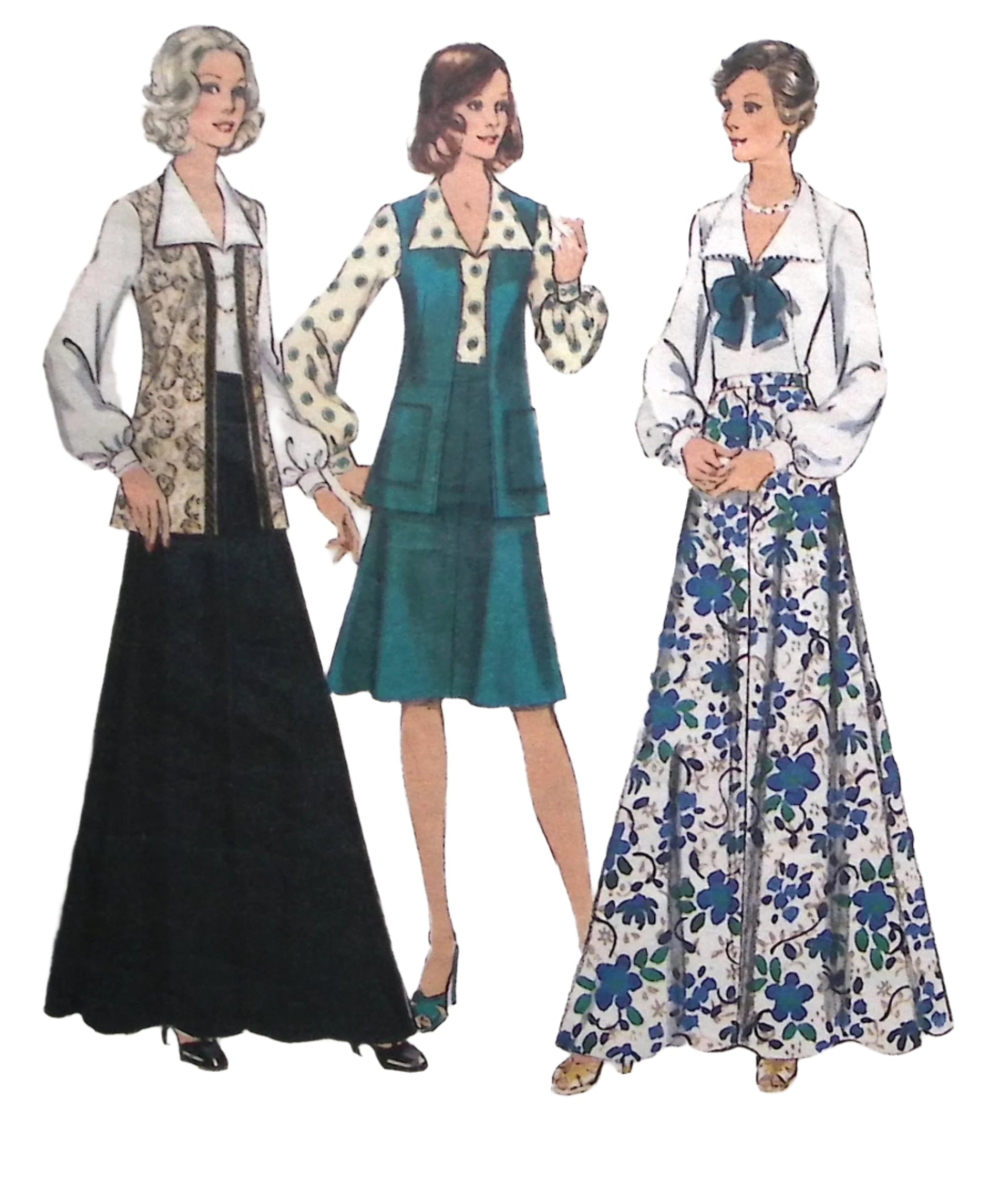 Misses' Skirt, Sleeveless Cardigan & Blouse: Step back in time with this vintage sewing pattern! You'll have a blast creating a variety of looks with this multi-purpose pattern, including two skirt lengths, a sleeveless cardigan, and a stylish blouse. Perfect for anyone looking to add some vintage flair to their wardrobe. ©1975. Rare Find!