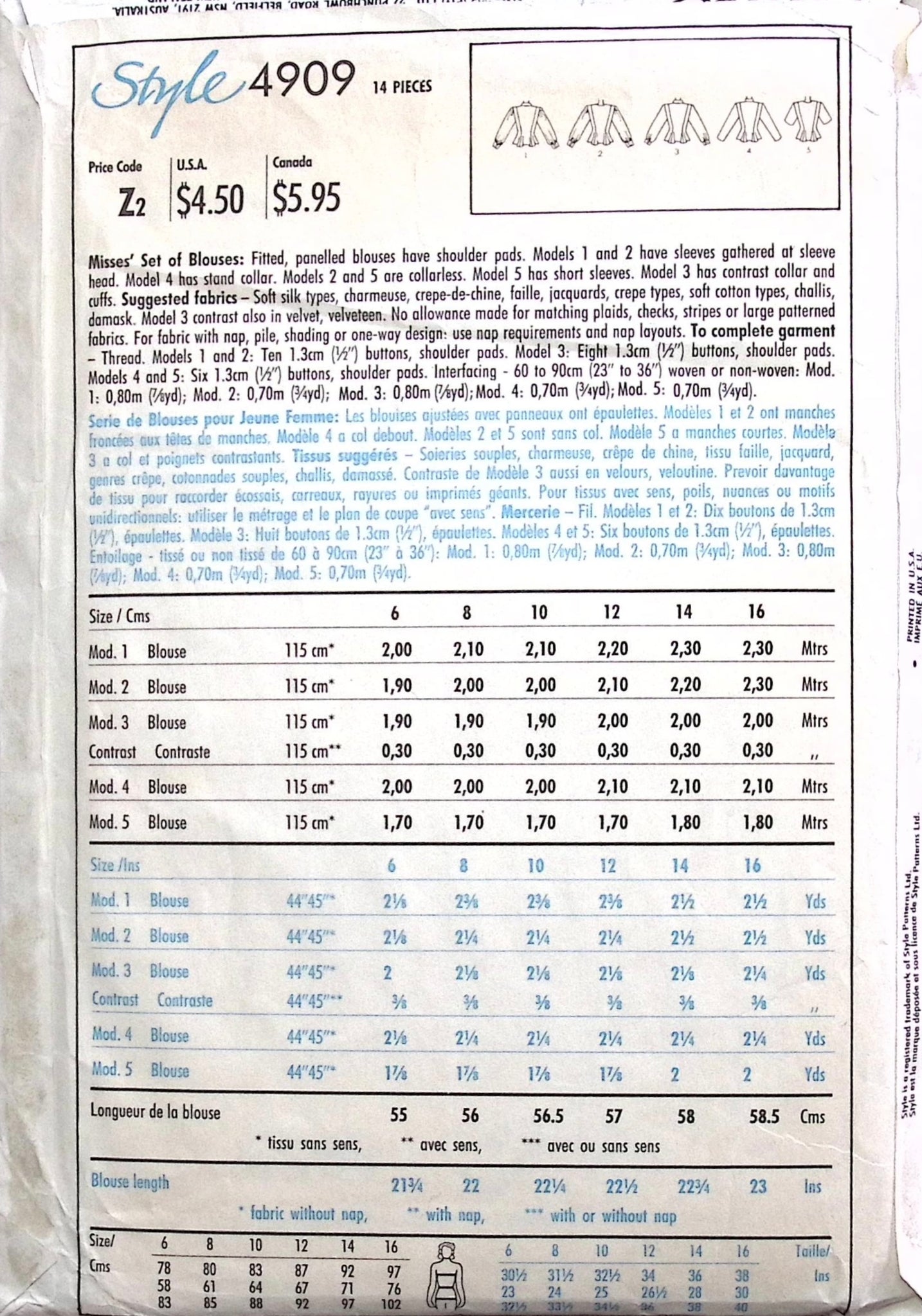 Misses’ Blouse: Featuring structured paneling and shoulder pads, these fitted blouses exude elegance. Choose from gathered showcase sleeves, a stand collar for a touch of modernity, or opt for a collarless or short-sleeve design for a more practical yet chic look. ©1986.