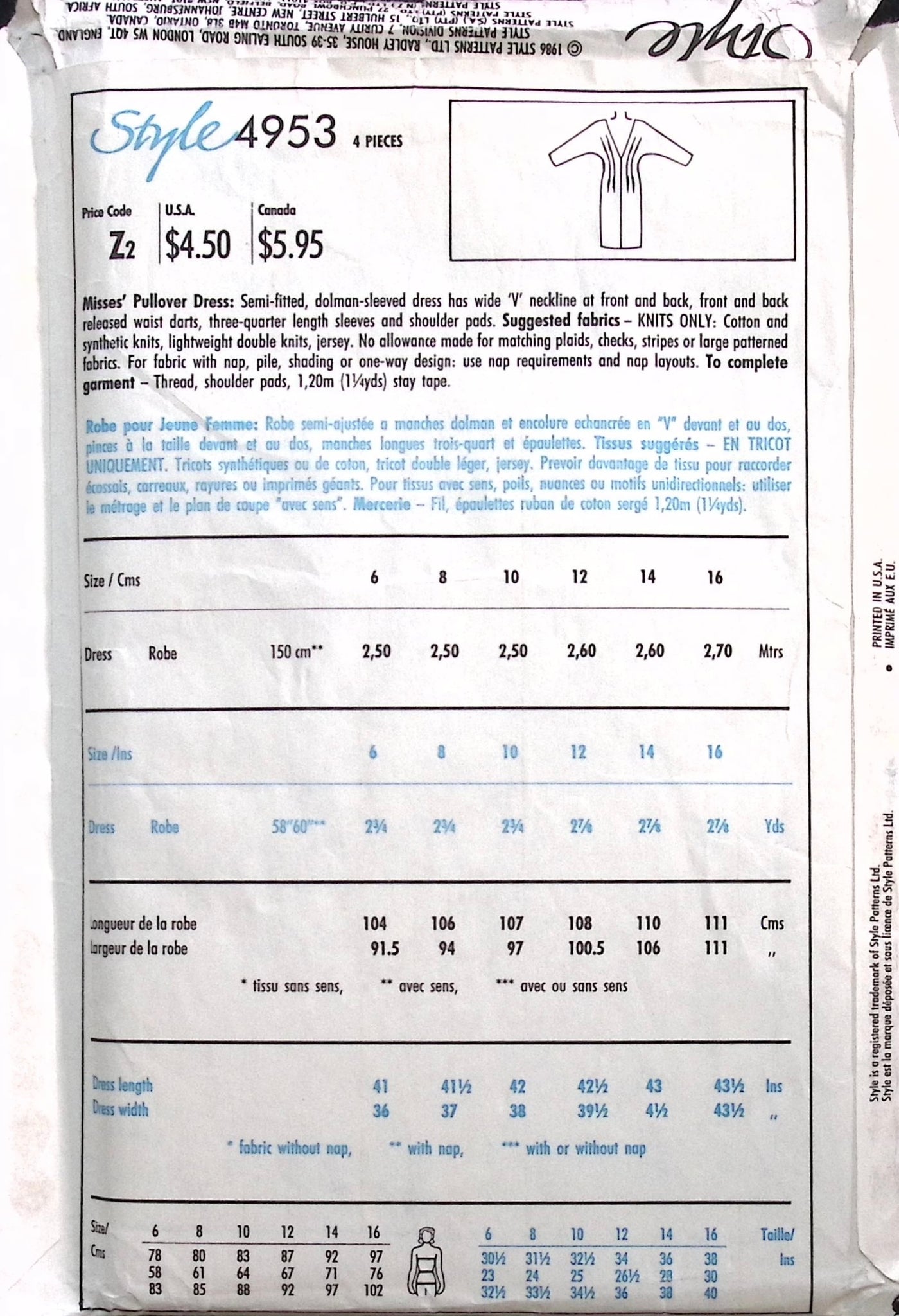 Misses’ Dress: A chic sewing pattern from the '80s, featuring a misses' dress with timeless elegance. This semi-fitted dress boasts dolman sleeves and a wide V neckline at the front and back, adding a touch of sophistication to your look. The front and back are released with waist darts, creating a flattering silhouette that accentuates your curves. With three-quarter length sleeves and shoulder pads for added structure, this dress is both stylish and comfortable. Whether you're attending a special event or heading to the office, this pattern offers versatility and classic charm for any occasion. ©1986. RARE FIND!.
