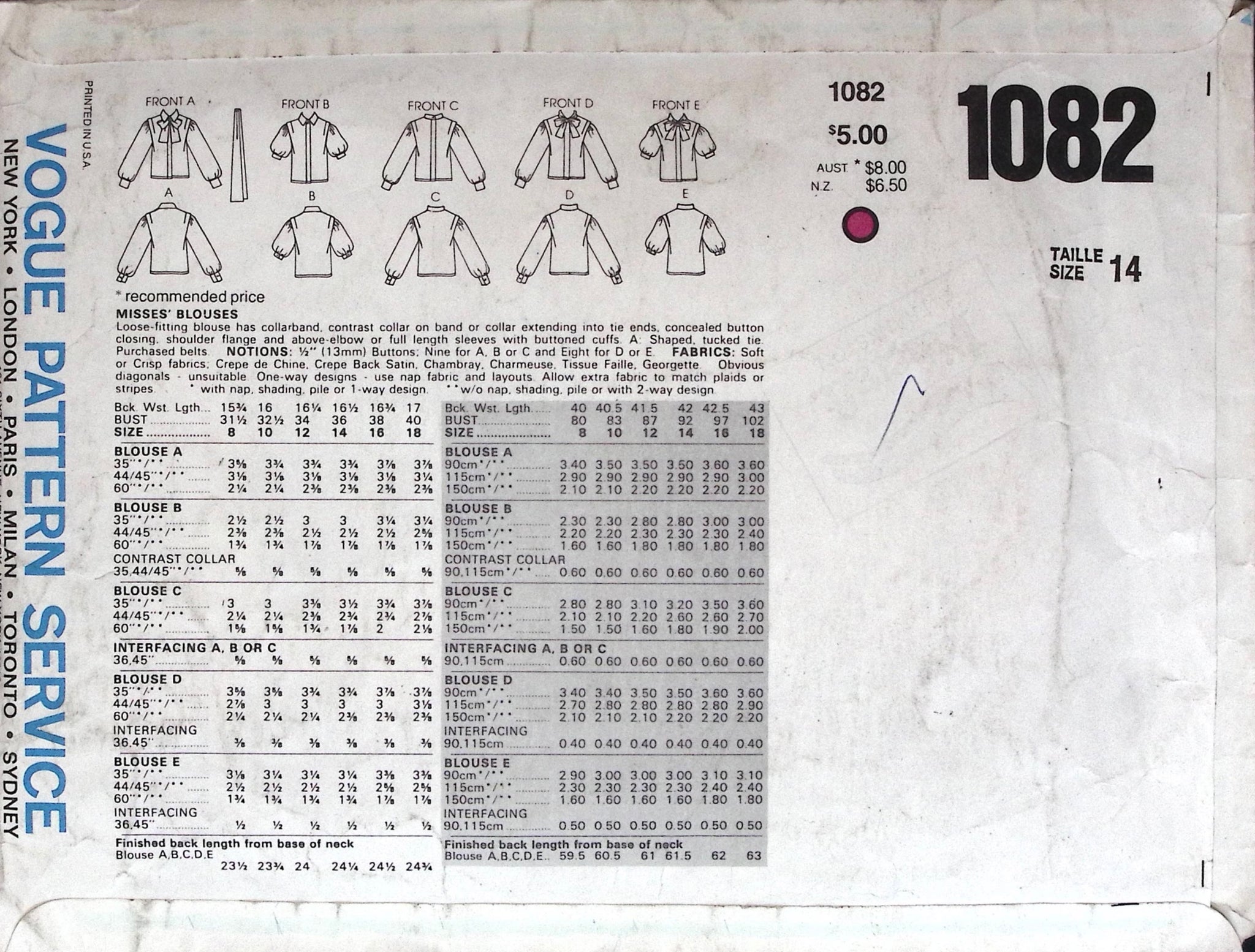 Misses' Blouses: Embrace the timeless charm of the 1980s with these Misses' Blouses, designed for a loose-fitting silhouette that effortlessly blends comfort and style. The blouses feature a collar-band with options for a contrast collar on the band or a collar extending into tie ends, creating a versatile and chic look. The concealed button closing adds a touch of sophistication, complemented by the shoulder flange and a choice between above-elbow or full-length sleeves with buttoned cuffs. Option A introduces a unique element with a shaped, tucked tie, and the blouses can be paired with purchased belts for added flair. Elevate your wardrobe with these classic yet fashionable blouses, capturing the essence of the eras elegance. ©1983.