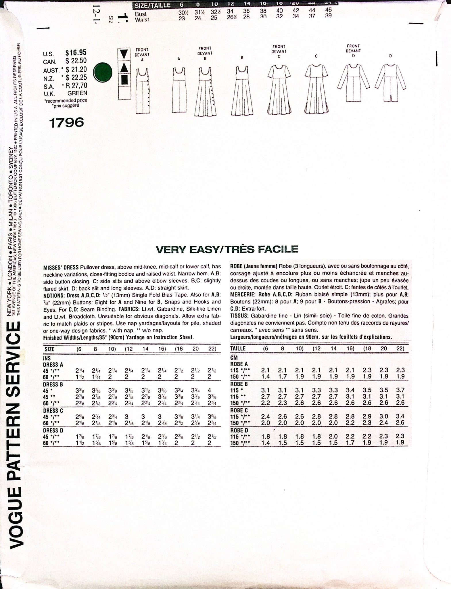 Misses' Pullover Dress: Create a versatile wardrobe staple with this pattern for a pullover dress, available in above mid-knee, mid-calf, or lower-calf lengths. The dress offers neckline variations, a close-fitting bodice, and a raised waist for a flattering silhouette. The front pleated bodice adds a touch of elegance, complemented by a flared skirt with a raised waist and convenient side pockets. Finish off the look with a narrow hem. Option A features dropped shoulders and long sleeves with stitched hems for added style. Tailor this dress to your preferred length and neckline, crafting a chic and comfortable garment for various occasions. ©1996.