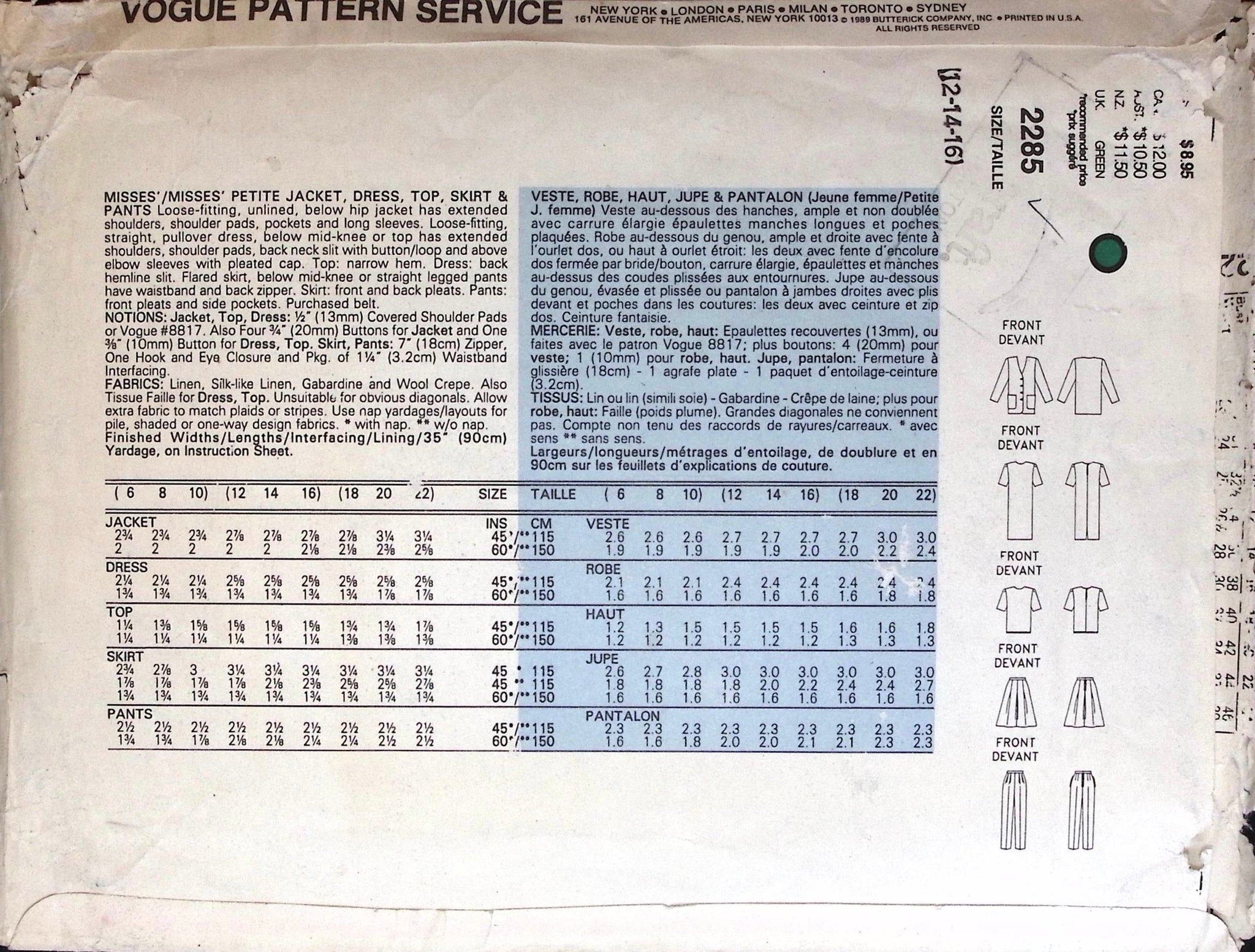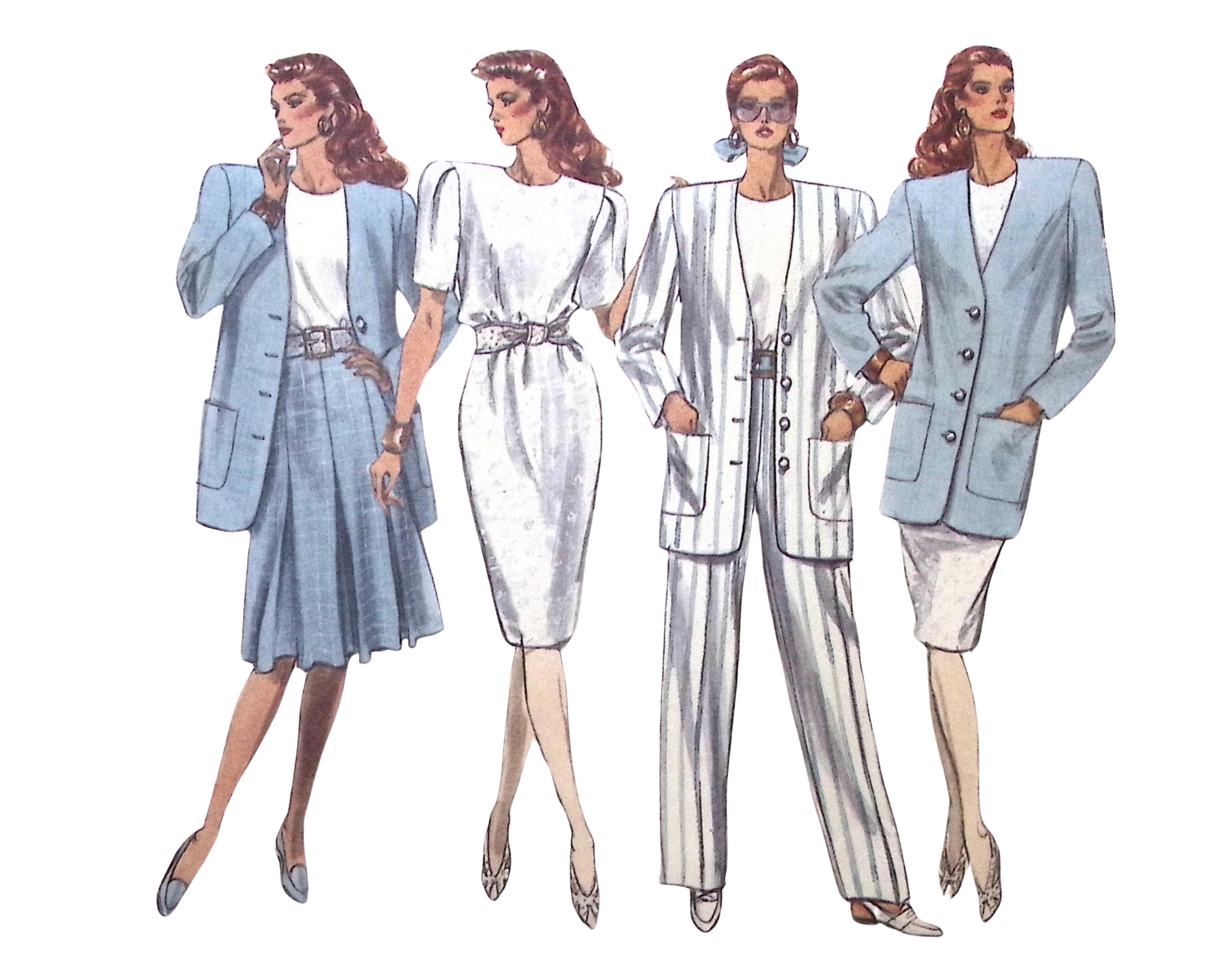 Misses'/Misses' Petite Jacket, Dress, Top, Pants & Skirt: The below-hip jacket, with its loose-fitting and unlined design, features extended shoulders, shoulder pads, pockets, and long sleeves for a timeless silhouette. Choose between a loose-fitting, straight, pullover dress or top with extended shoulders, shoulder pads, a back neck slit with a button/loop, and above-elbow sleeves with pleated caps. The top boasts a narrow hem, while the dress features a back hemline slit. For bottom options, revel in the versatility of a pleated skirt below mid-knee or straight-legged pants, both equipped with a waistband and back zipper. The skirt showcases front and back pleats, while the pants boast front pleats and side pockets. Elevate your wardrobe with this ensemble that captures the essence of the era. ©1989.