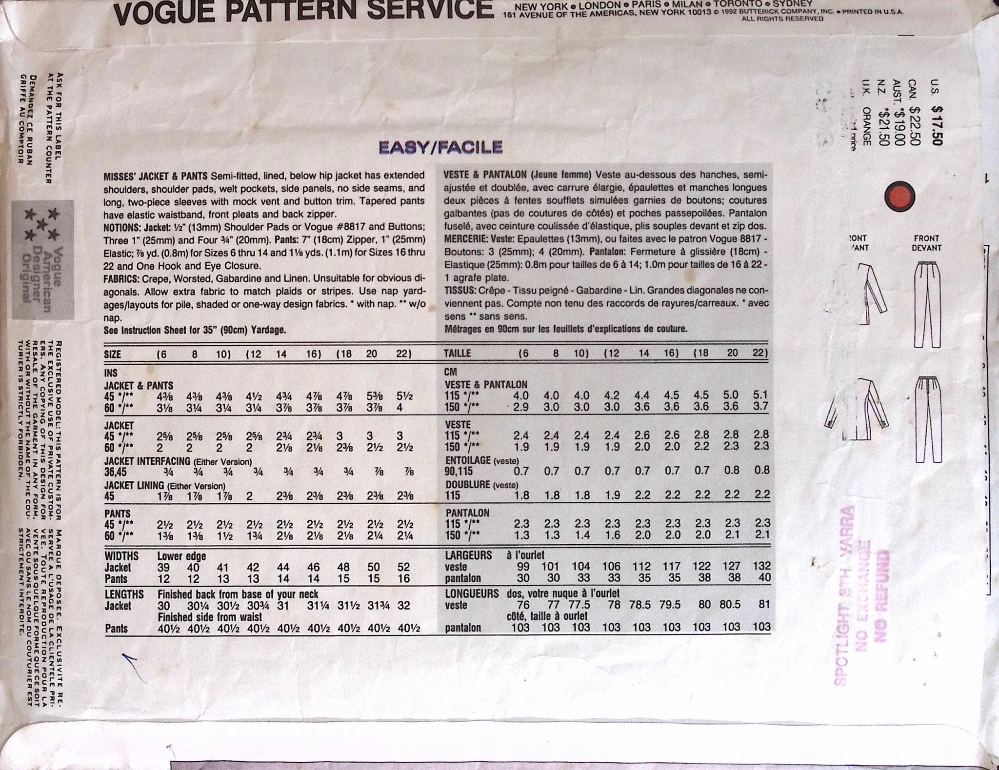 Misses' Jacket & Pants: Designed by Donna Karan: This vintage Vogue sewing pattern offers a playful twist on classic style with a semi-fitted, lined jacket featuring unique construction and long, sleek pants for a chic look. Perfect for the fashion-forward and creative seamstress! ©1992.