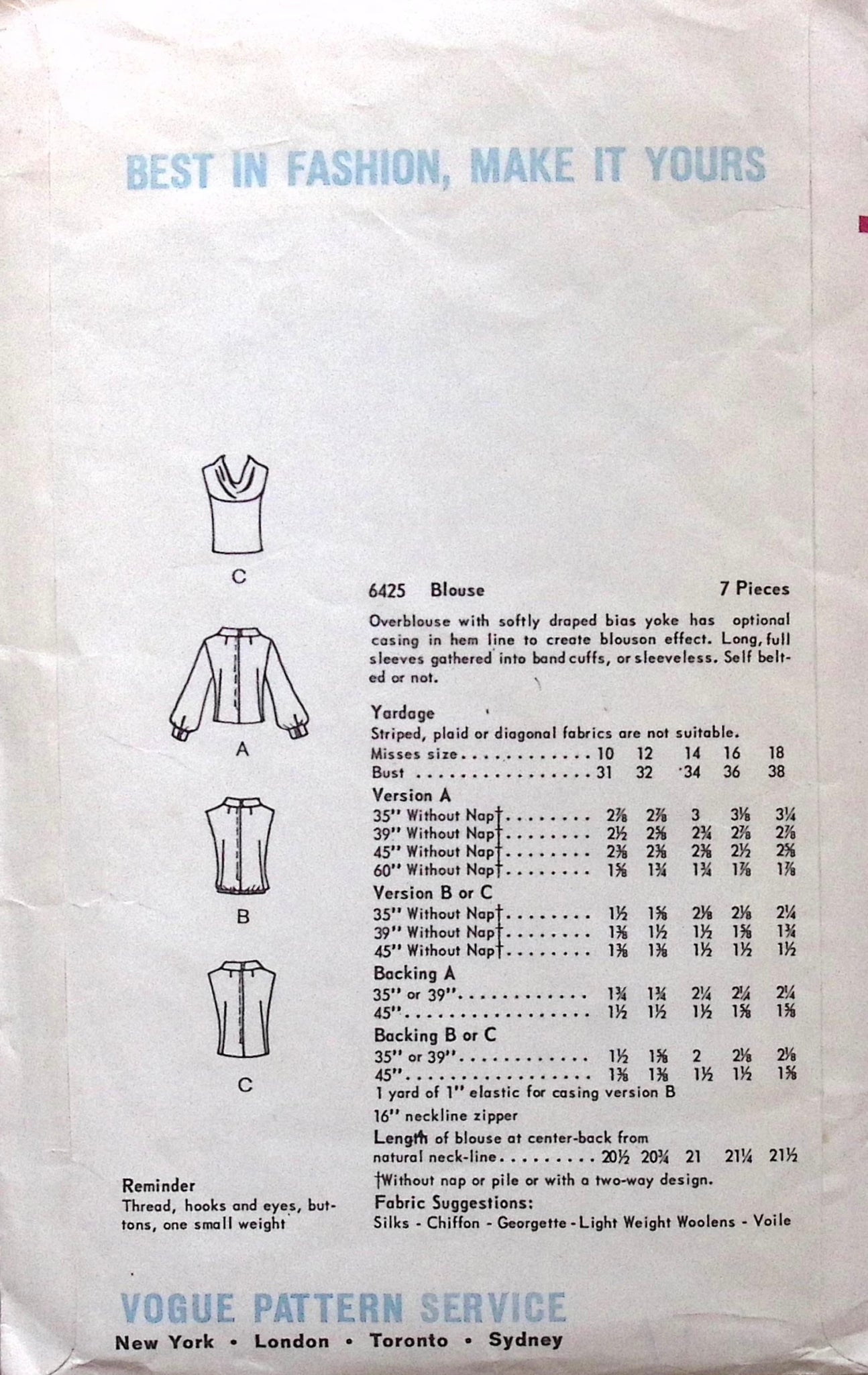 Misses' Blouse: Get creative with this vintage Vogue sewing pattern for a stylish Overblouse! With a softly draped bias yoke and optional casing, you can create a blouson effect. Choose between long full sleeves with gathered band cuffs or a sleeveless option. Complete the look with a self-belt or leave it off. Sew cool, sew chic, sew Vogue 6425. ©1965. RARE FIND!