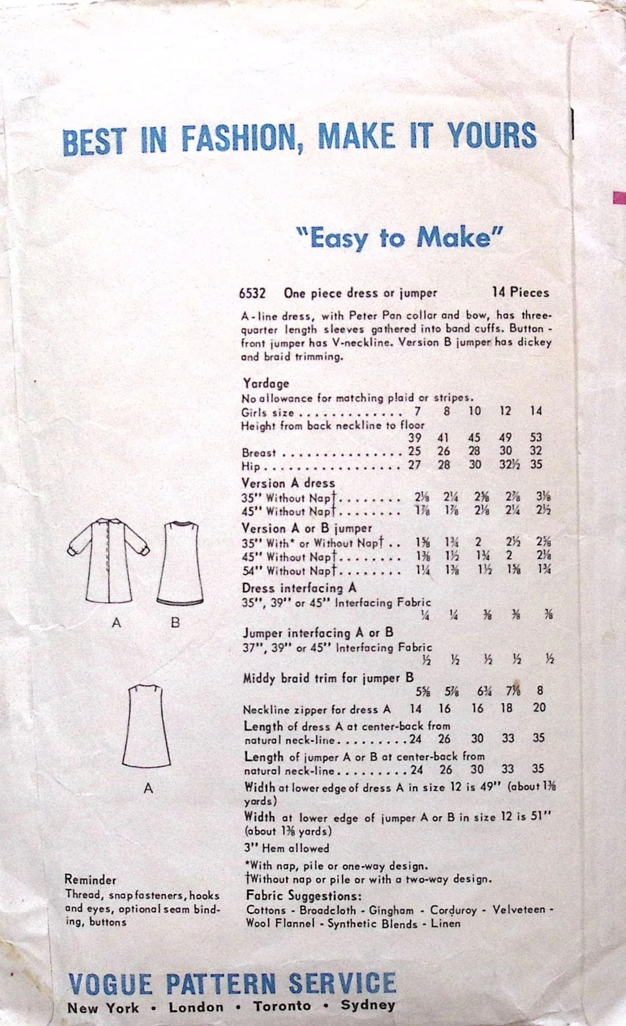 Girl's Dress: This vintage sewing pattern from Vogue is a must-have for any stylish child! With a 1960's mod design, it features an A-line trapeze style button front jumper and a playful pussy bow shift dress. Get creative and sew your little one's new favorite outfit with this Vogue 6532 pattern. ©1960's. RARE FIND!