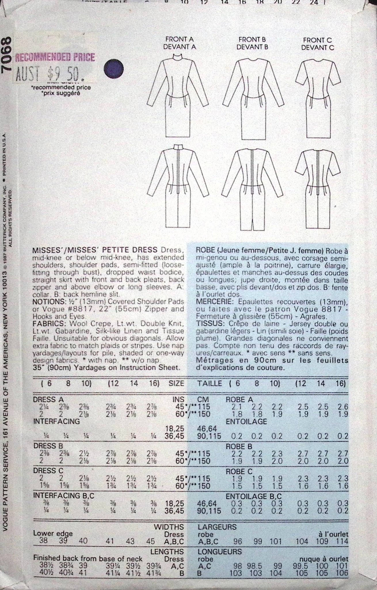 Misses’ Dress: This mid-knee or below mid-knee dress features extended shoulders and shoulder pads, providing a subtly structured silhouette. The semi-fitted, drop-waist bodice seamlessly flows into a straight skirt adorned with front and back pleats, creating a flattering and modern look. The back zipper ensures ease of wear, while the option of above-elbow or long sleeves allows for customisation based on your style preference. Perfect for various occasions, this dress pattern combines comfort and chic design for a graceful ensemble. ©1987.