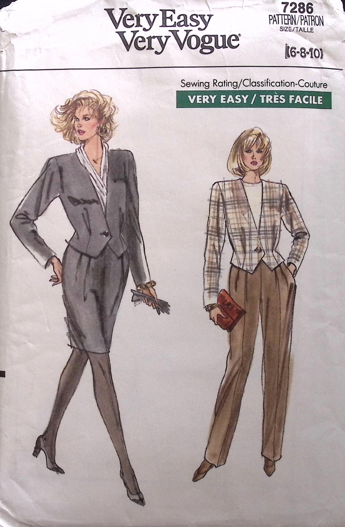 Misses' Jacket, Skirt & Pants: Look stylishly retro with Vogue's Vintage Sewing Pattern: 7286. This pattern features a semi-fitted, unlined, waist-length jacket with subtle tucks and extended shoulders for a flattering fit. Complete the look with a tapered skirt or pants, both with convenient pockets. Sewing has never been so chic! ©1988.