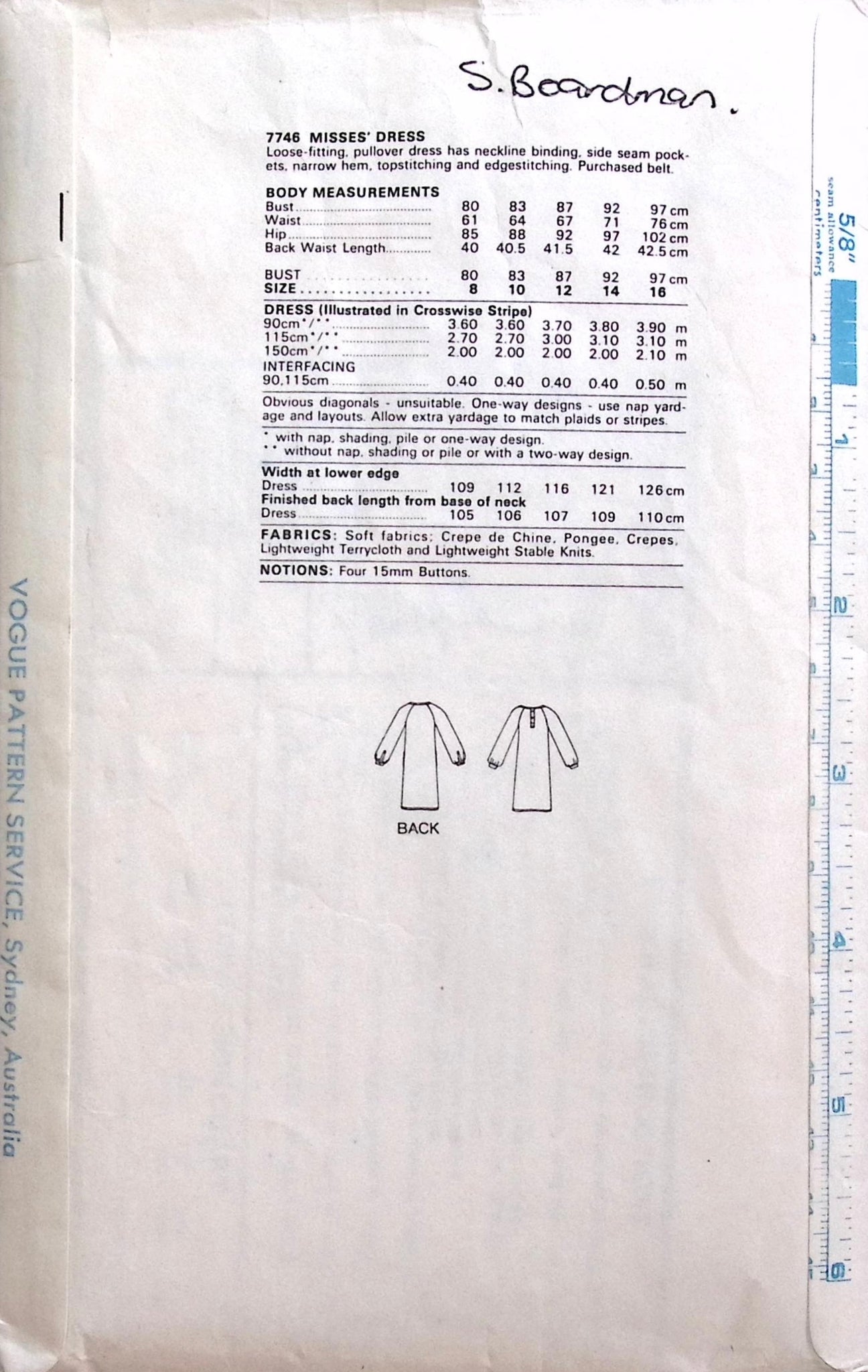 Misses' Dress: Revamp your wardrobe with this vintage sewing pattern for the Vogue 7746 dress. With a loose-fit and stylish side seam pockets, this pullover dress offers comfort and convenience. Its neckline binding and top stitching add to its classic appeal. ©1980's.