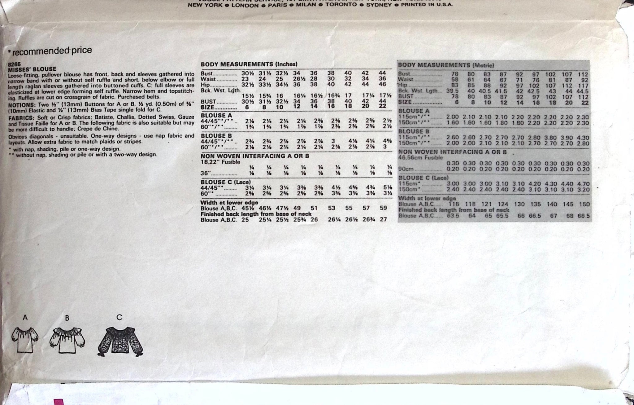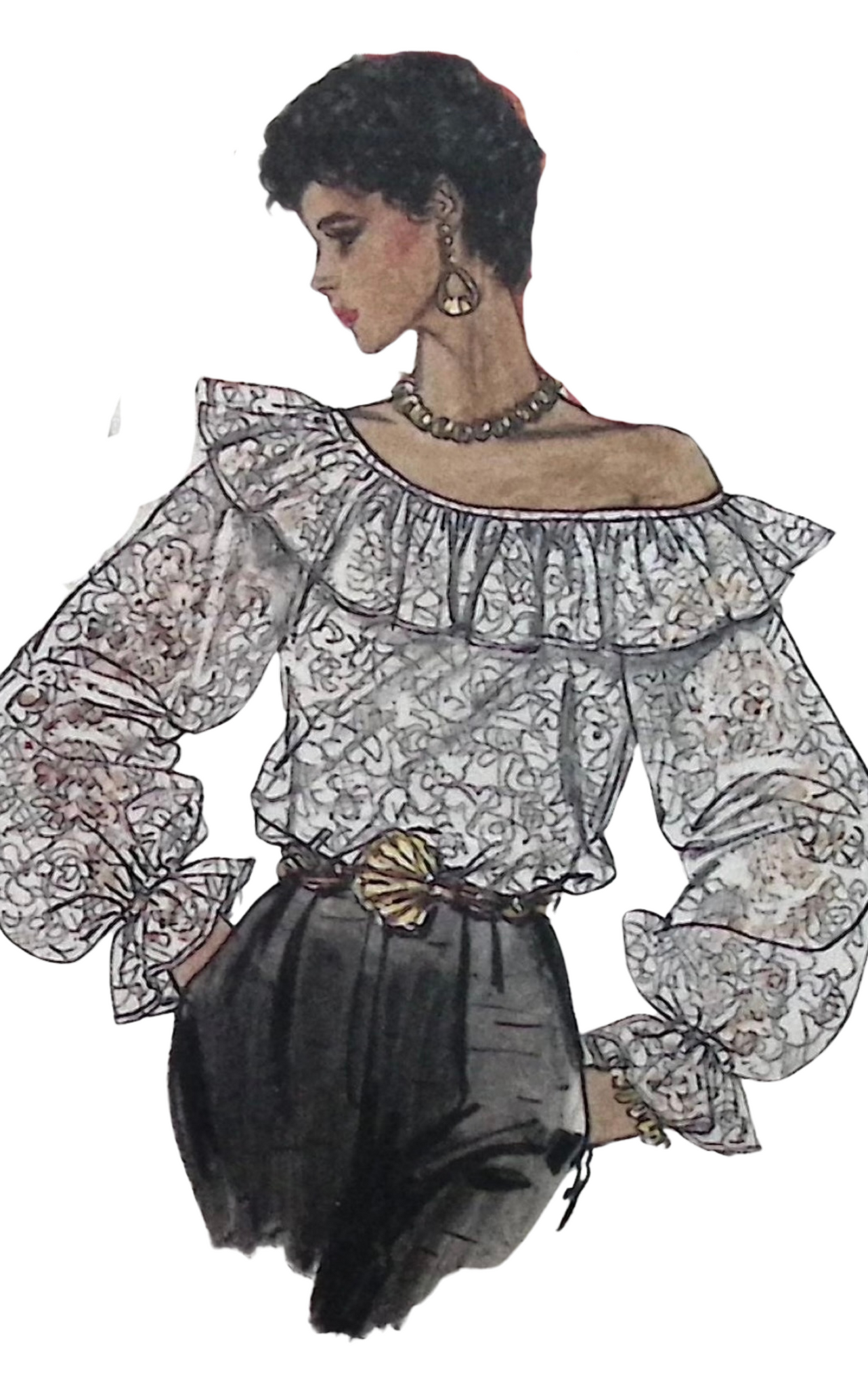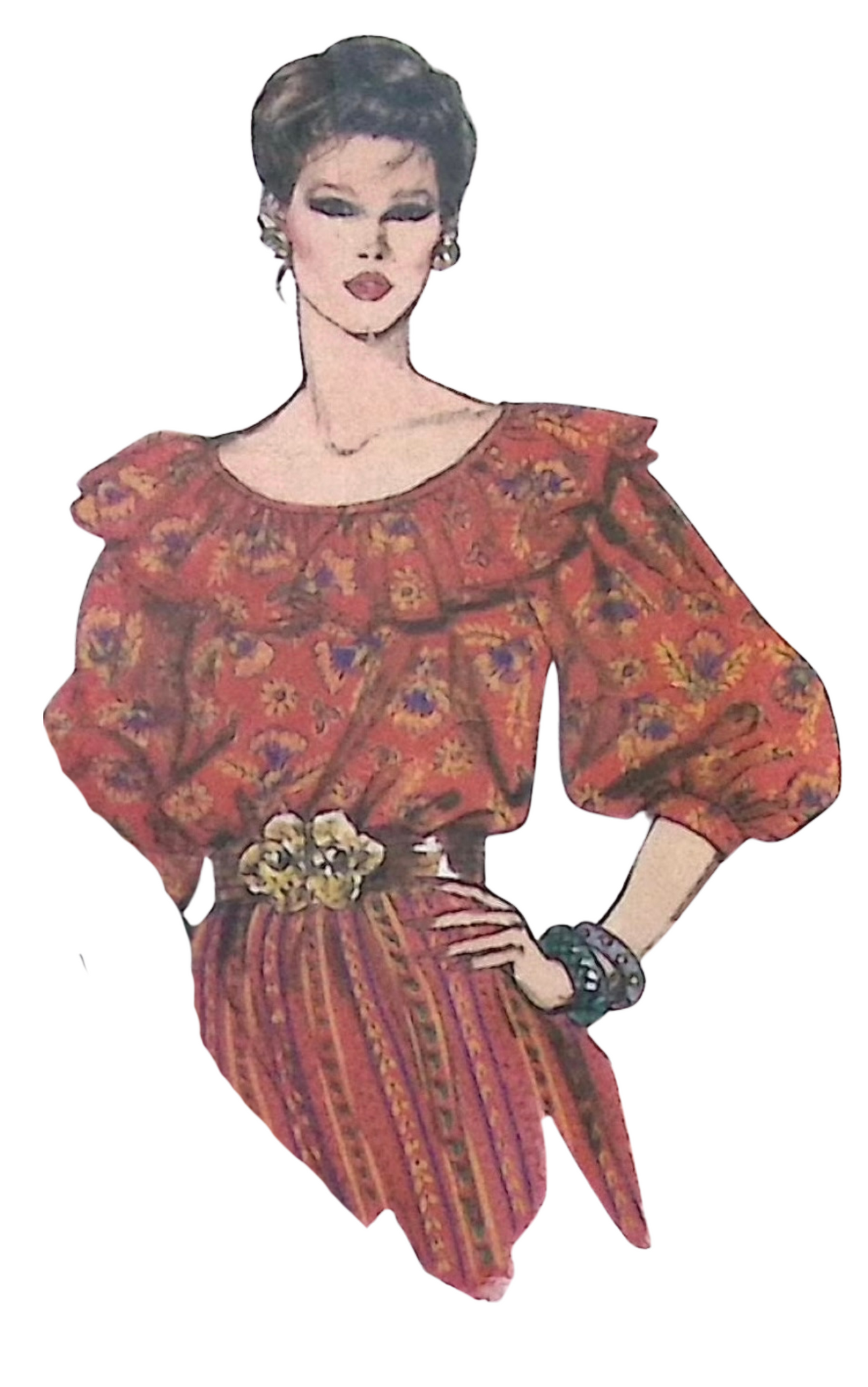 Misses’ Blouse: This loose-fitting, pullover blouse features front, back, and sleeves gathered into a narrow band, offering a flattering silhouette with or without a self-ruffle. Choose from short, below-elbow, or full-length raglan sleeves gathered into buttoned cuffs, allowing for customisation to suit your preference and the occasion. Opt for full sleeves elasticised at the lower edge to form a self-ruffle, adding a touch of feminine charm. Complete with a narrow hem and topstitching for a polished finish, this blouse exudes effortless sophistication. Ruffles are cut on the crossgrain of the fabric, adding visual interest and texture to the design. ©1982.