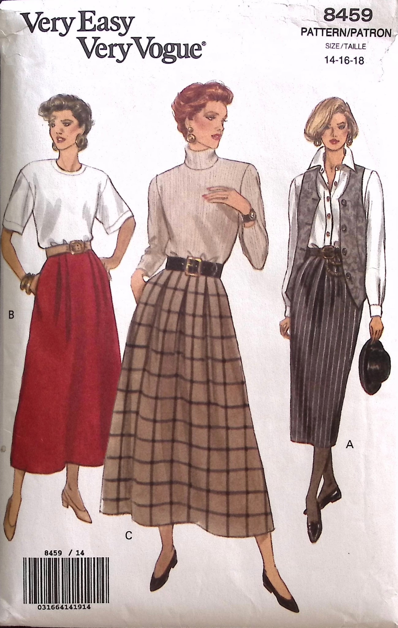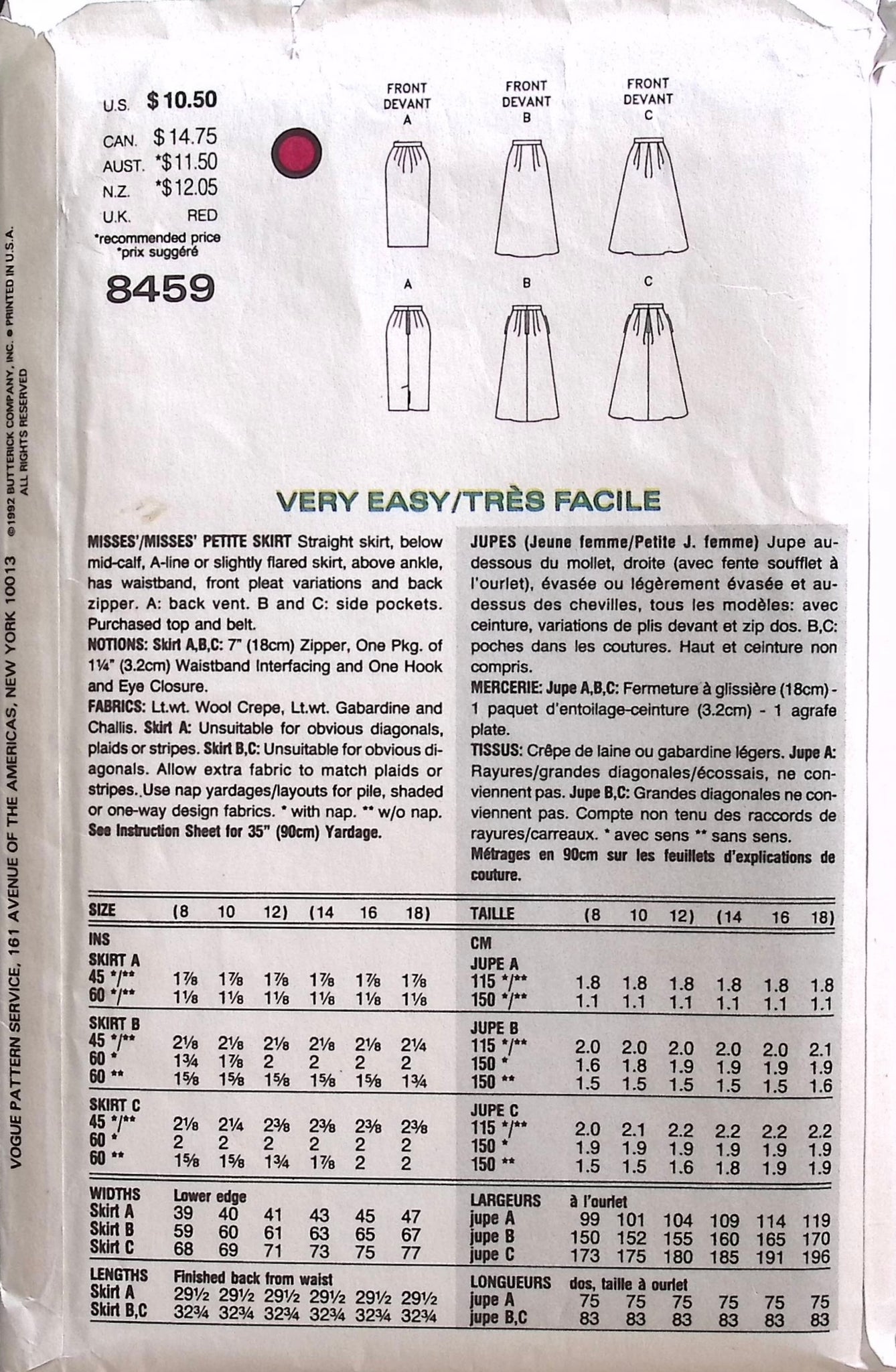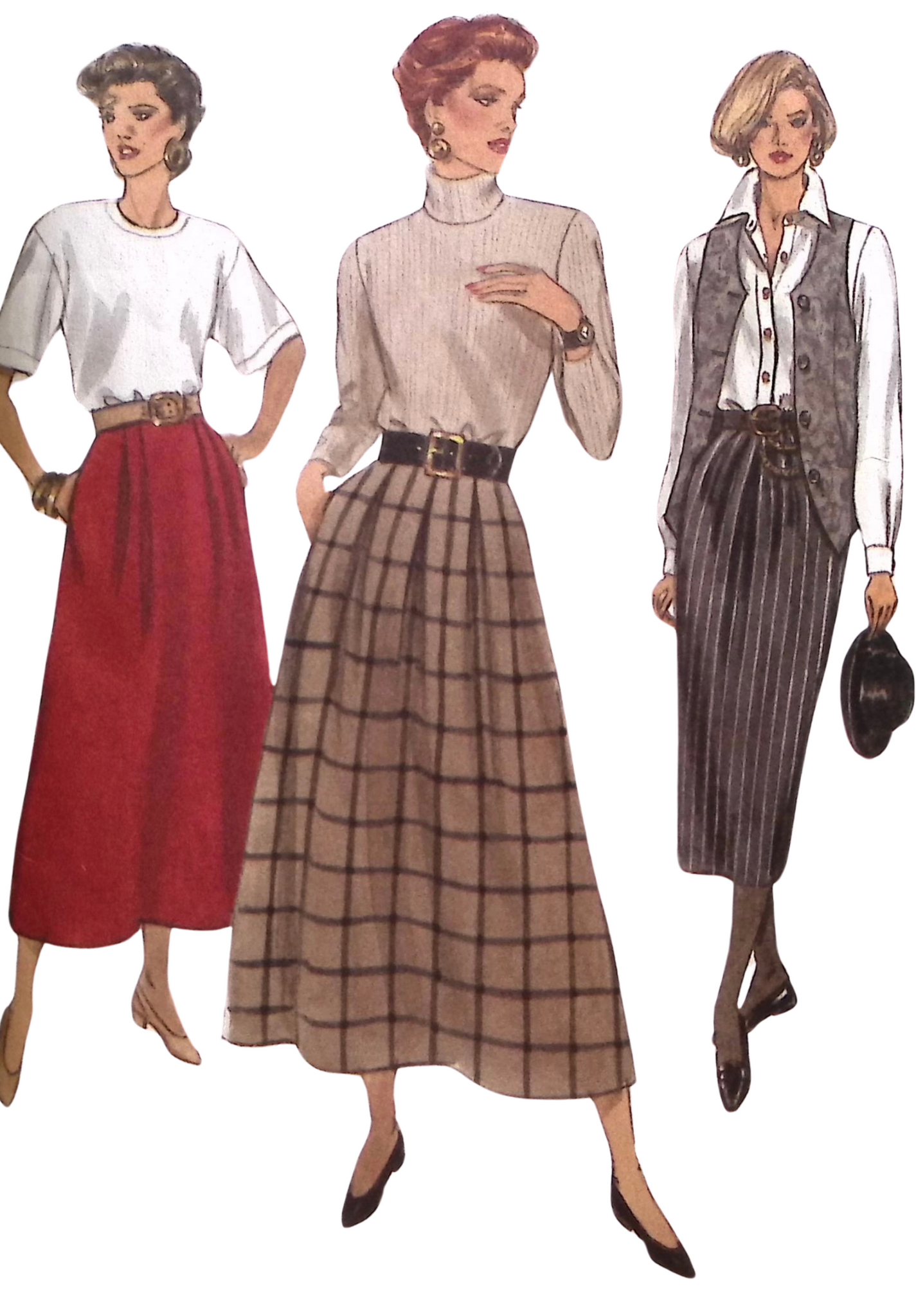 Misses’ Skirt: The straight skirt, available below mid-calf, or the A-line and slightly flared options above the ankle, all feature a waistband, various front pleat styles, and a convenient back zipper. Option A comes with a stylish back vent for added flair. Options B and C include side pockets, combining functionality with fashion. Elevate your ensemble with a purchased top and belt, making this pattern a go-to choice for creating a polished and coordinated look. ©1992.