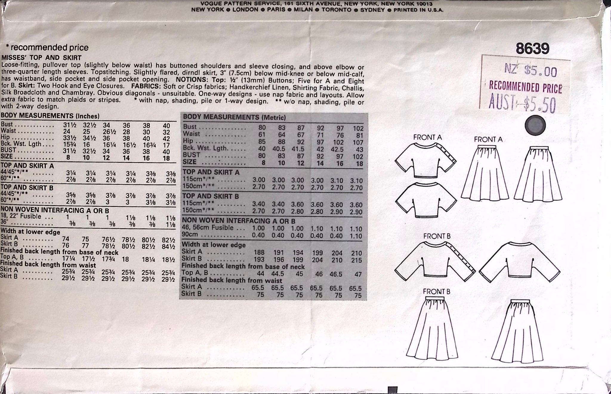 Misses’ Top & Skirt: A delightful combination of comfort and style. The loose-fitting, pullover top, falling slightly below the waist, features charming buttoned shoulders and sleeve closings, with options for above-elbow or three-quarter length sleeves. Topstitching adds a touch of detail to the design. The slightly flared dirndl skirt, available 3" (7.5cm) below mid-knee or below mid-calf, is equipped with a waistband, side pocket, and a convenient side pocket opening. Create a versatile and effortlessly chic ensemble with this pattern, offering endless possibilities for a personalised wardrobe. ©1983.