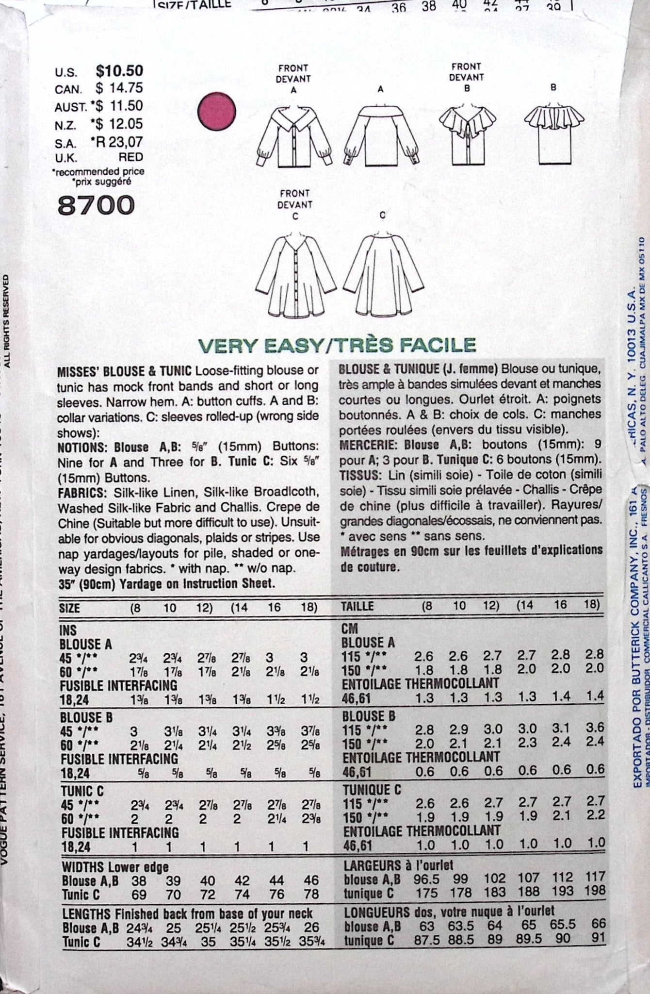 Misses' Blouse & Tunic: Transport yourself to the stylish trends of 1993 with this sewing pattern. Offering a loose-fitting silhouette, both the blouse and tunic exude a relaxed yet sophisticated charm. The design features mock front bands and provides versatility with short or long sleeves to suit your preference. The narrow hem adds a neat finish to the overall look. Option A includes button cuffs for a touch of tailored elegance. Choose between different collar variations to customise your outfit. For a casual and laid-back vibe, option C allows you to roll up the sleeves, revealing the charming wrong side. Stay on-trend and express your individual style with this fashionable sewing pattern. ©1993.