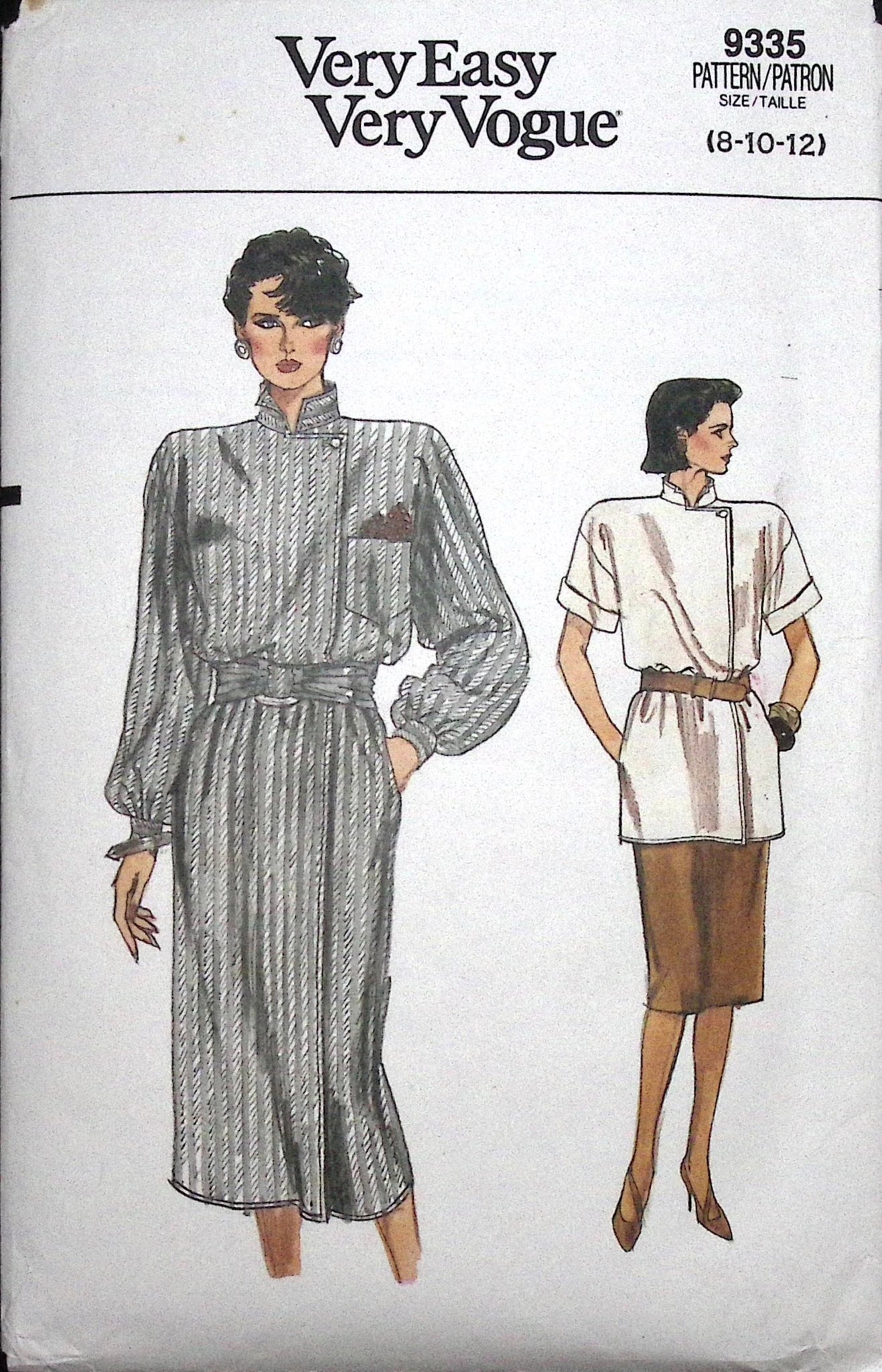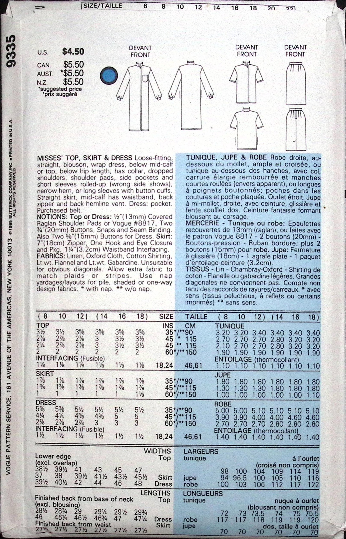 Misses’ Top, Skirt & Dress: The loose-fitting, straight blouson wrap dress, available in below mid-calf length, effortlessly transitions from casual to dressy occasions. The ensemble features a collar, dropped shoulders, and stylish shoulder pads for a modern silhouette. Choose between a top, hitting below the hip, or a dress with narrow hems, providing a relaxed yet sophisticated look. For added flair, opt for long sleeves with button cuffs. The straight skirt, designed to mid-calf length, includes a waistband, back zipper, and a back hemline vent, creating a polished and versatile outfit for any setting. ©1985.