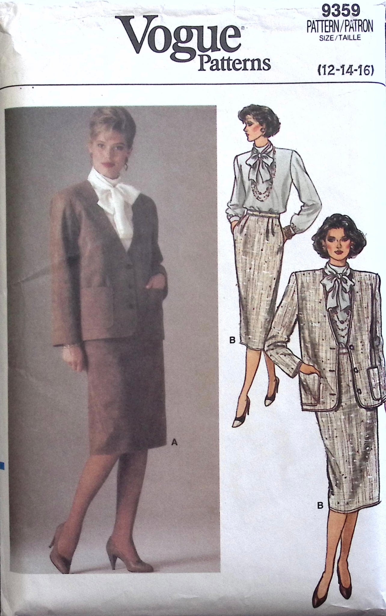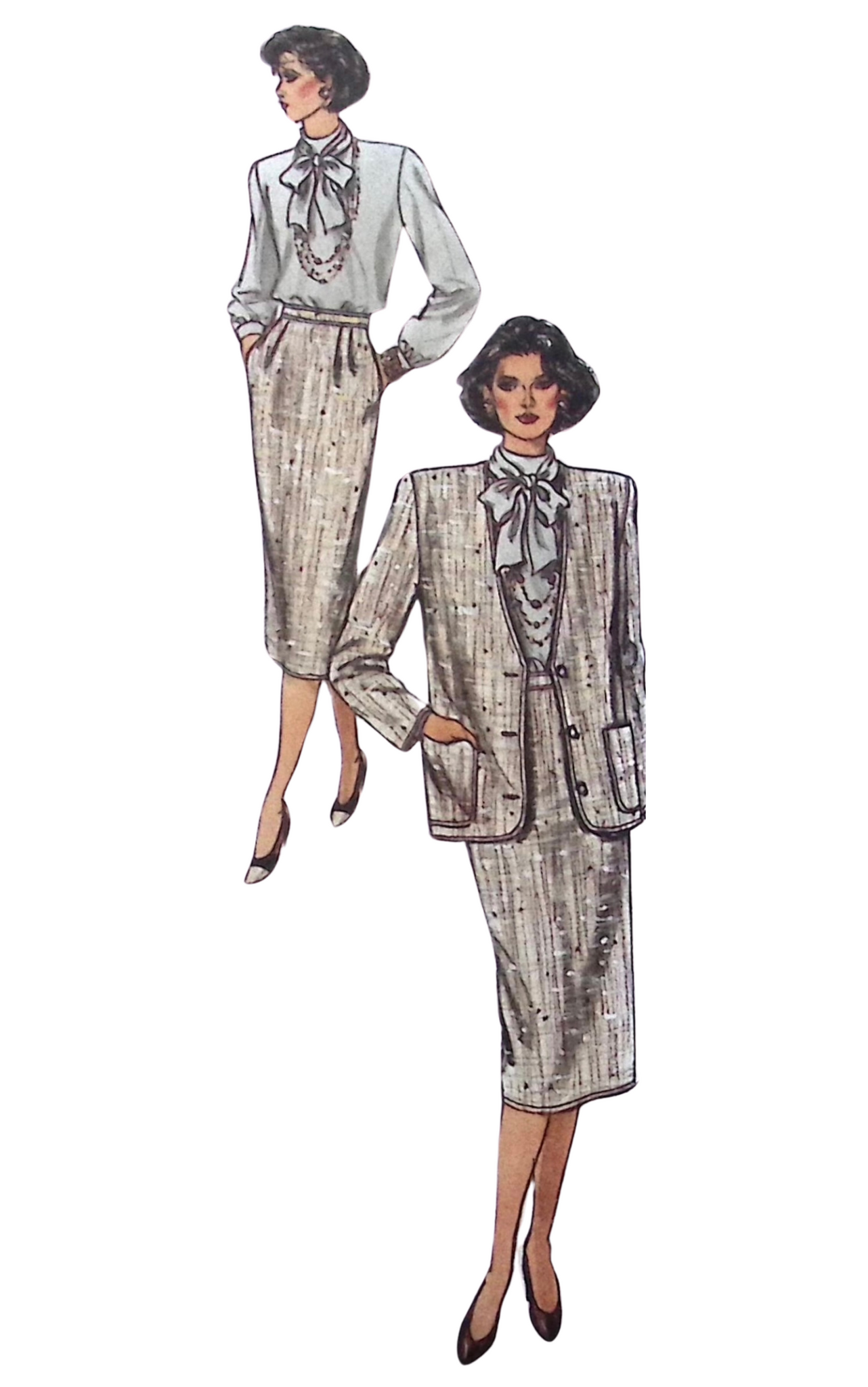 Misses’ Jacket, Blouse & Skirt: The below-hip jacket features a loose-fitting silhouette with extended shoulders, shoulder pads for structure, pockets for added functionality, and long sleeves for a classic look. The loose-fitting pullover blouse boasts a collar extending into tie ends, a back neckline slit, extended shoulders, and long sleeves with button cuffs, adding a touch of elegance to any outfit. Complete the ensemble with a straight skirt, available in both below mid-knee or mid-calf lengths, featuring a waistband, front pleats for a flattering fit, side pockets for convenience, a back vent for ease of movement, and a back zipper for closure. This timeless ensemble captures the essence of ‘80s fashion, making it perfect for both work and play. ©1985.