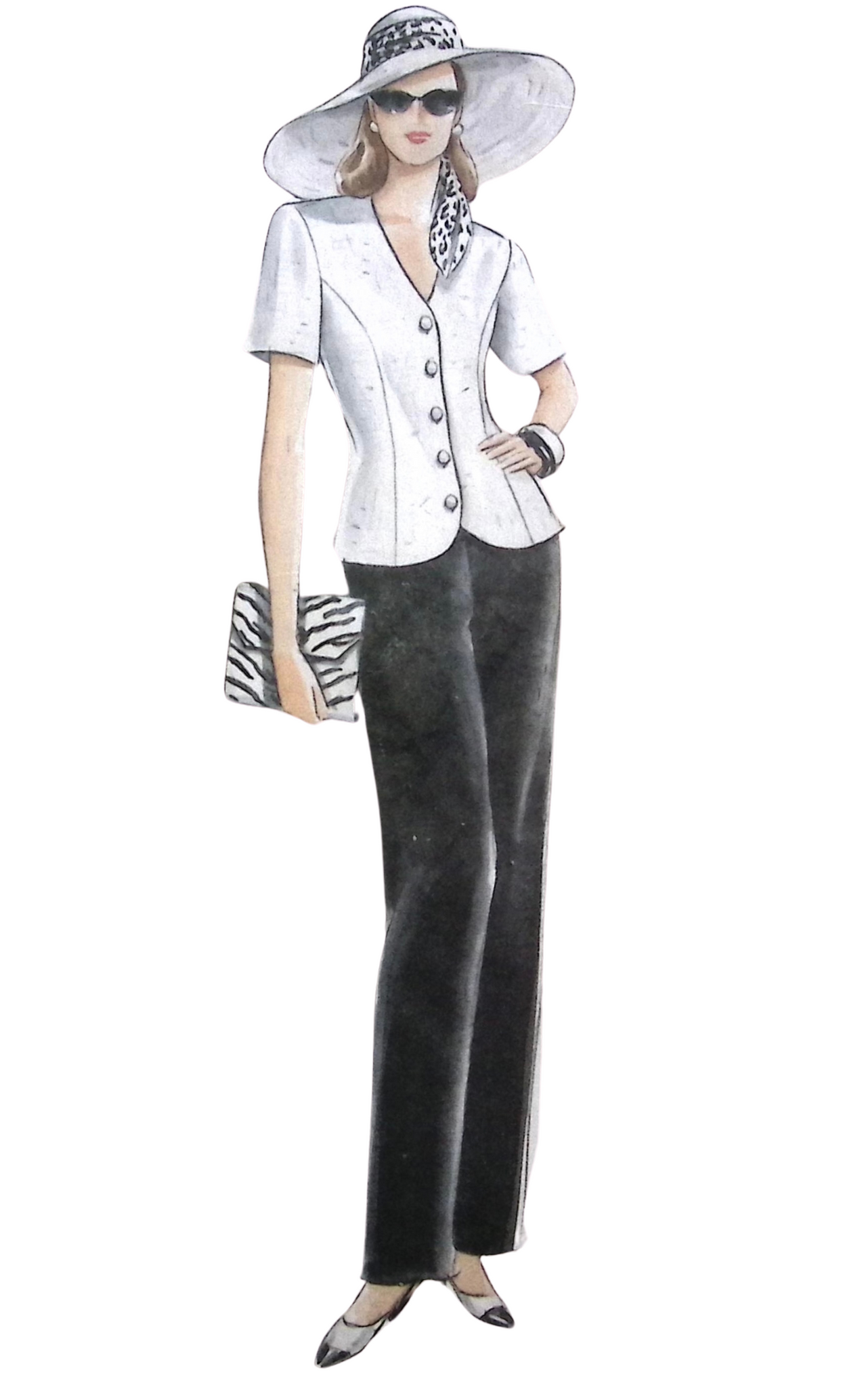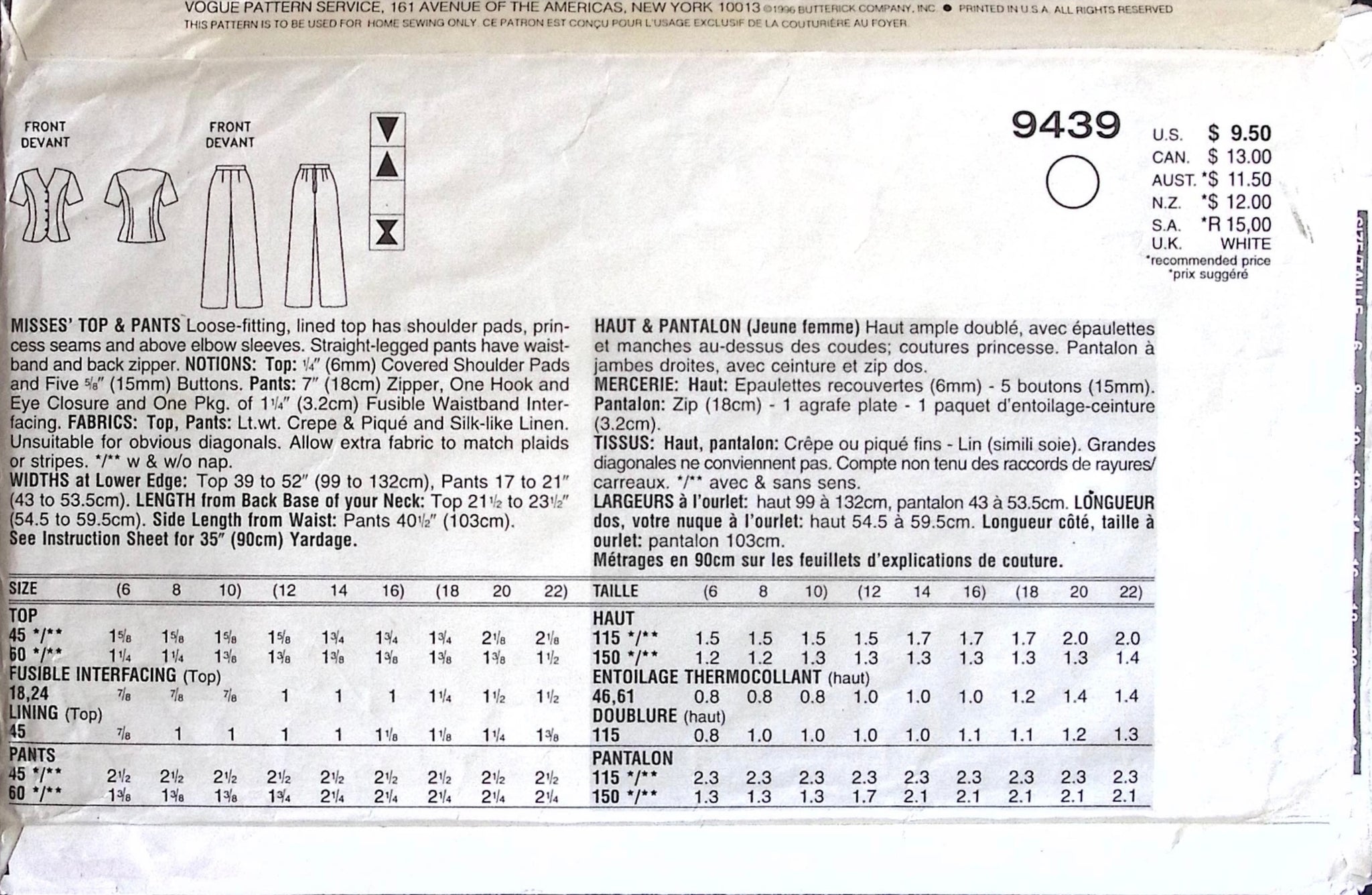 Misses’ Top & Pants: The loose-fitting lined top features shoulder pads for structure, princess seams for a flattering fit, and above-elbow sleeves for a classic touch. Pair it with the straight-legged pants, which boast a comfortable waistband and a back zipper for easy wear. ©1996.