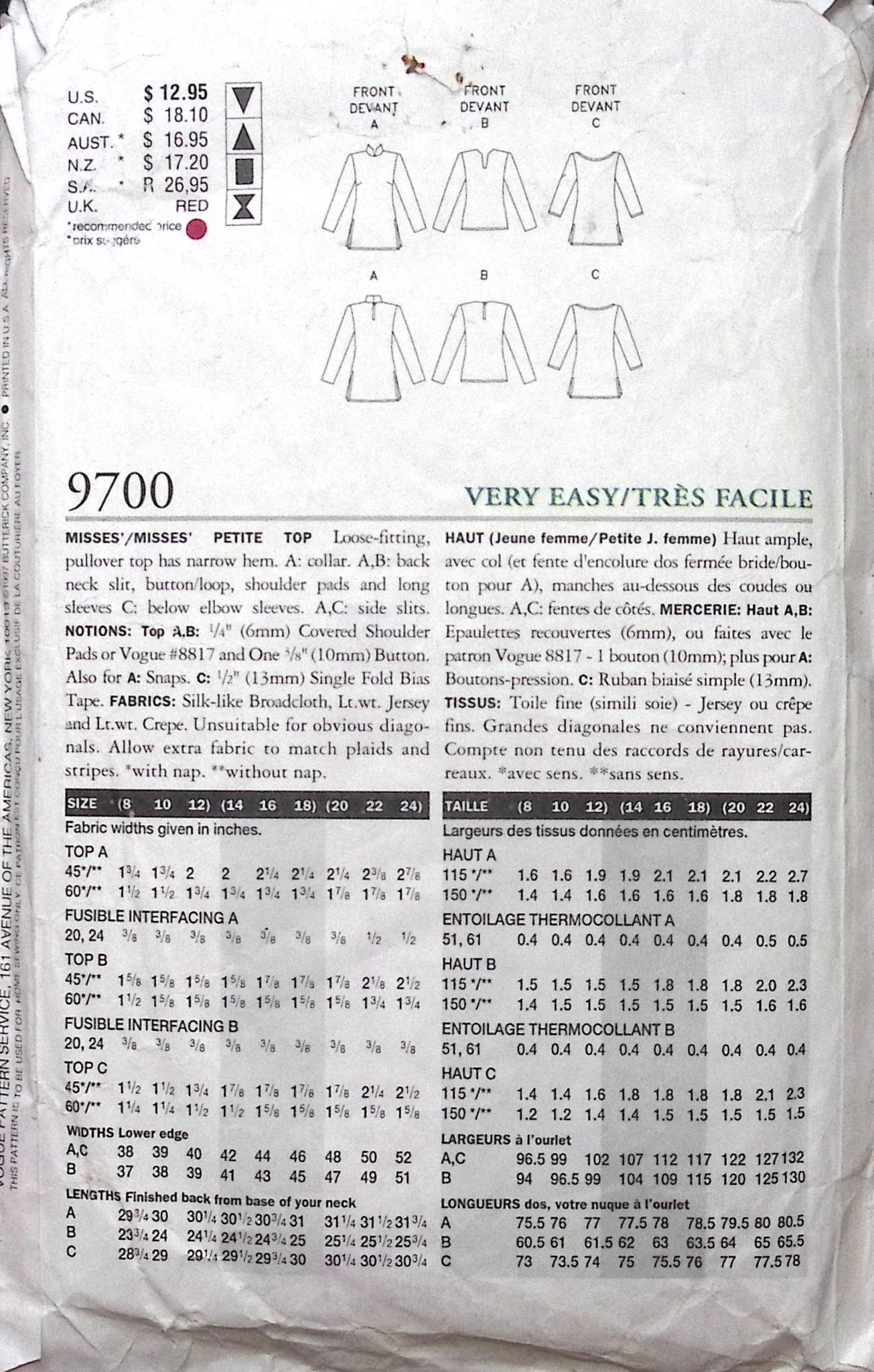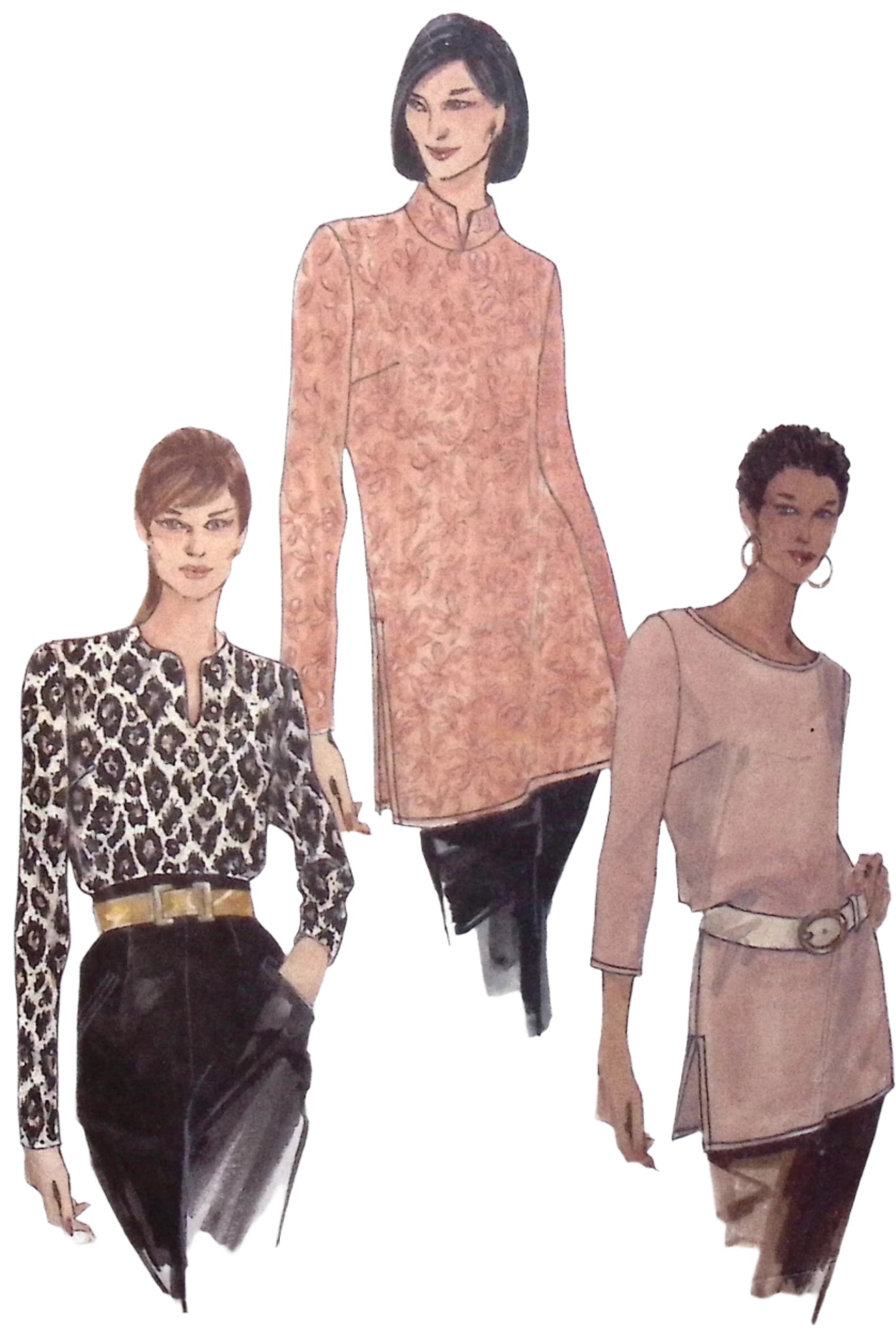 Misses' Tops: Sew in some vintage charm with this loose-fitting pull-over top from Vogue! Perfect for all body types, this top can be worn with or without a collar, and features a neck slit for added flair. Plus, shoulder pads and various sleeve options make this top versatile for any occasion. ©1997.