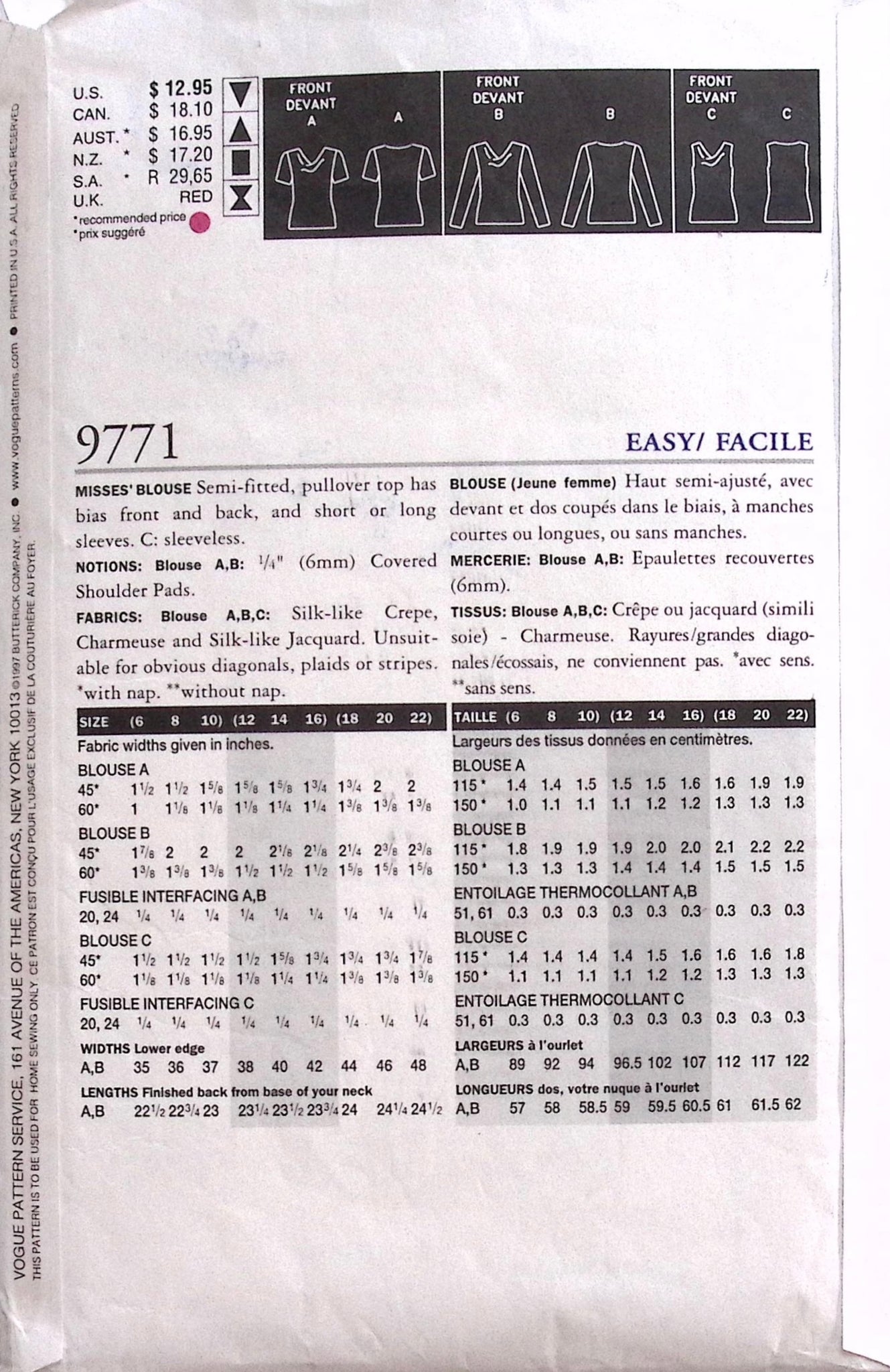 Misses' Blouse: Add a touch of vintage charm to your wardrobe with the Vogue 9771 sewing pattern. This misses blouse features a comfortable, semi-fitted design with a bias front and back for a flattering silhouette. Choose between short or long sleeves, or go sleeveless for a versatile and stylish look. Perfect for any occasion! ©1997.